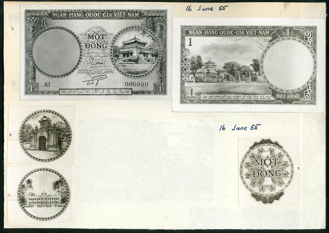 (x) National Bank of Vietnam, South Vietnam, [2 notes and 3 vignettes] obverse and reverse photo proof 1 Dong, 6th June 1955, unadopted design