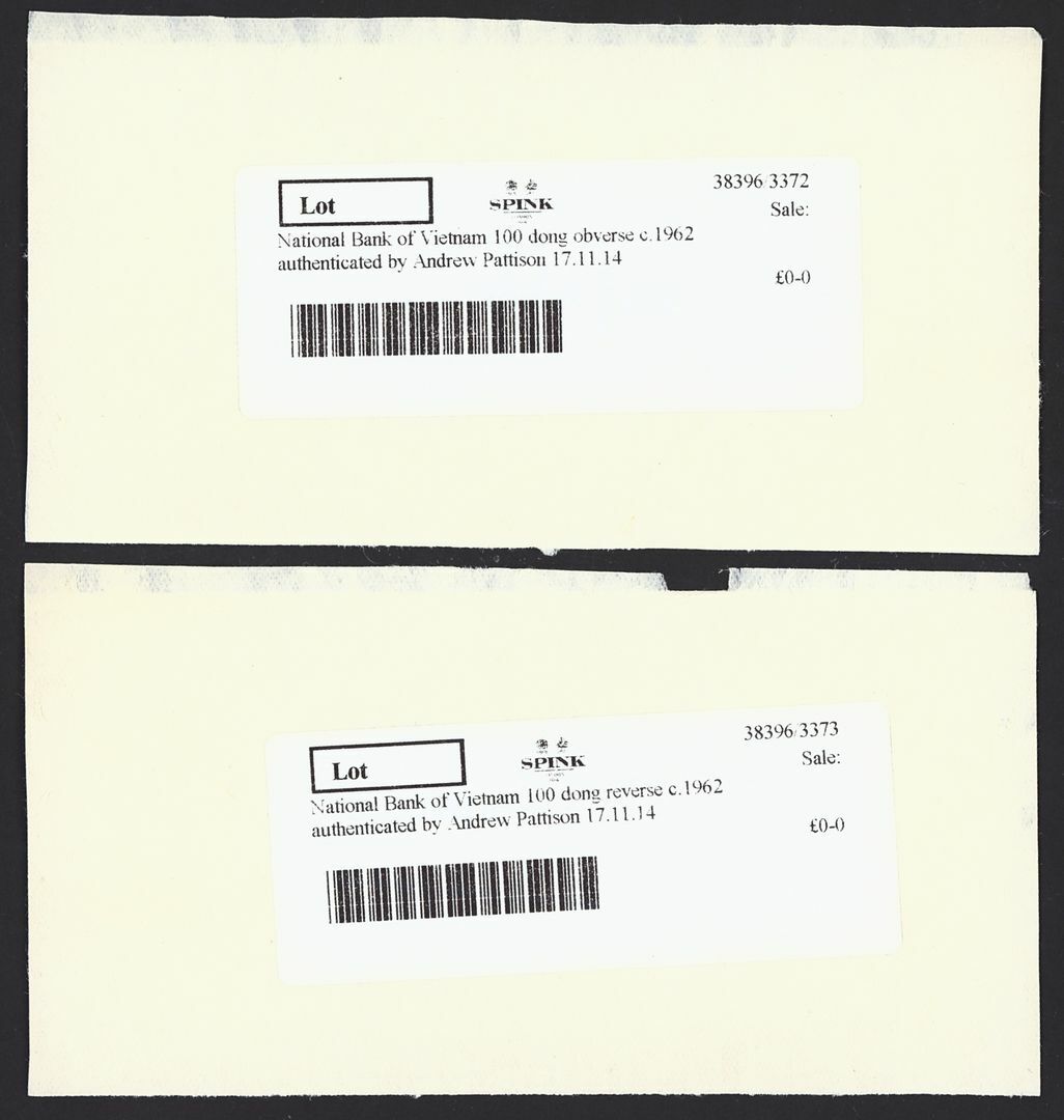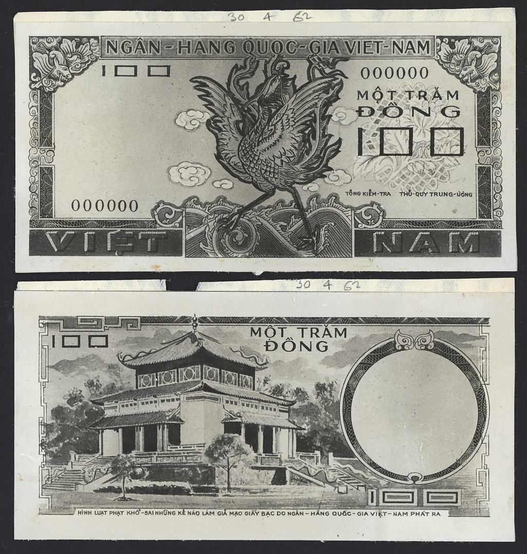 (x) National Bank of Vietnam, South Vietnam, [2 notes] obverse and reverse photo proof 100 Dong, 30th April 1962, unadopted design