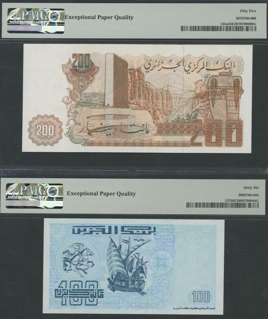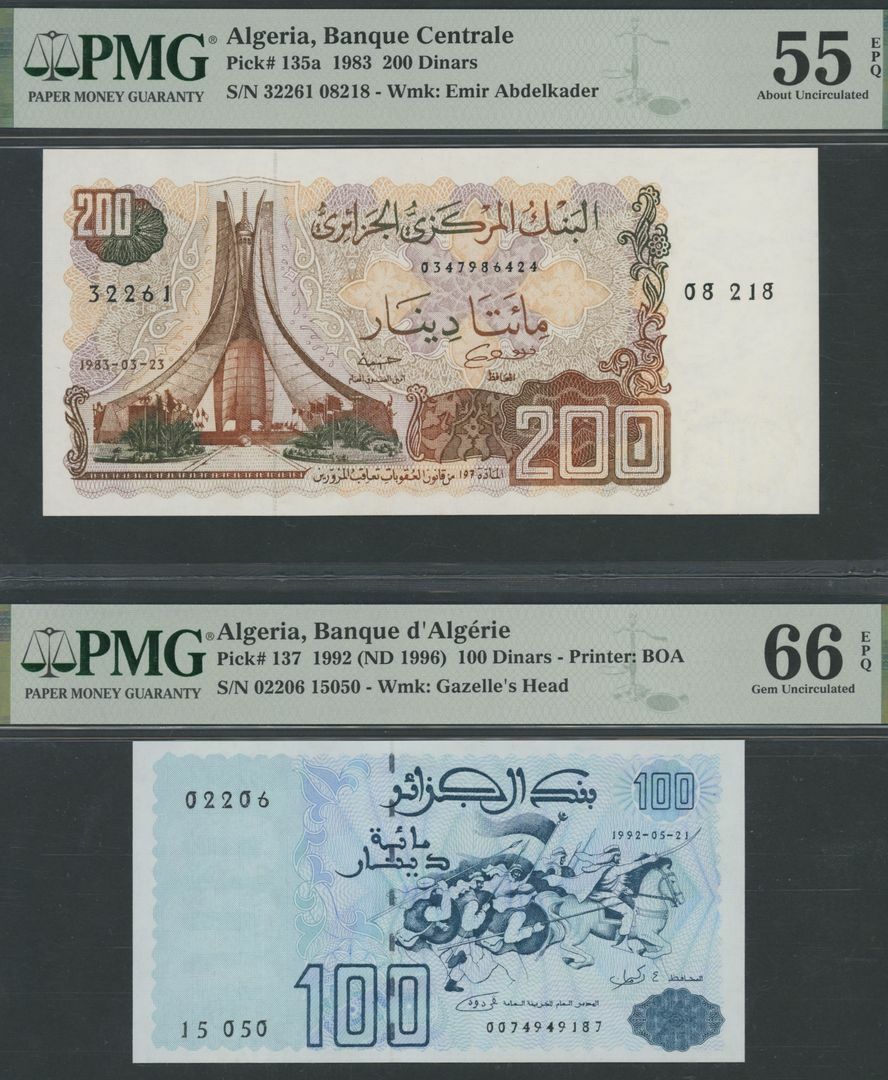 Algeria (2), 100 Dinars, 1992, serial number 02206 15050, 200 Dinars, 1983, serial number 32261 08218;