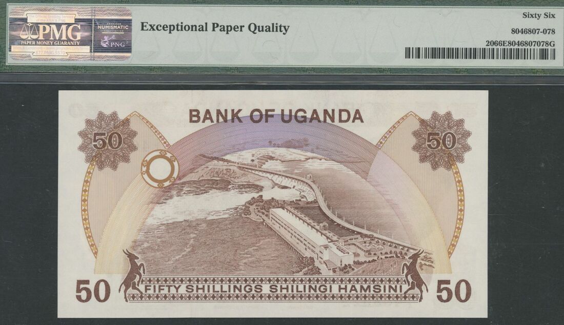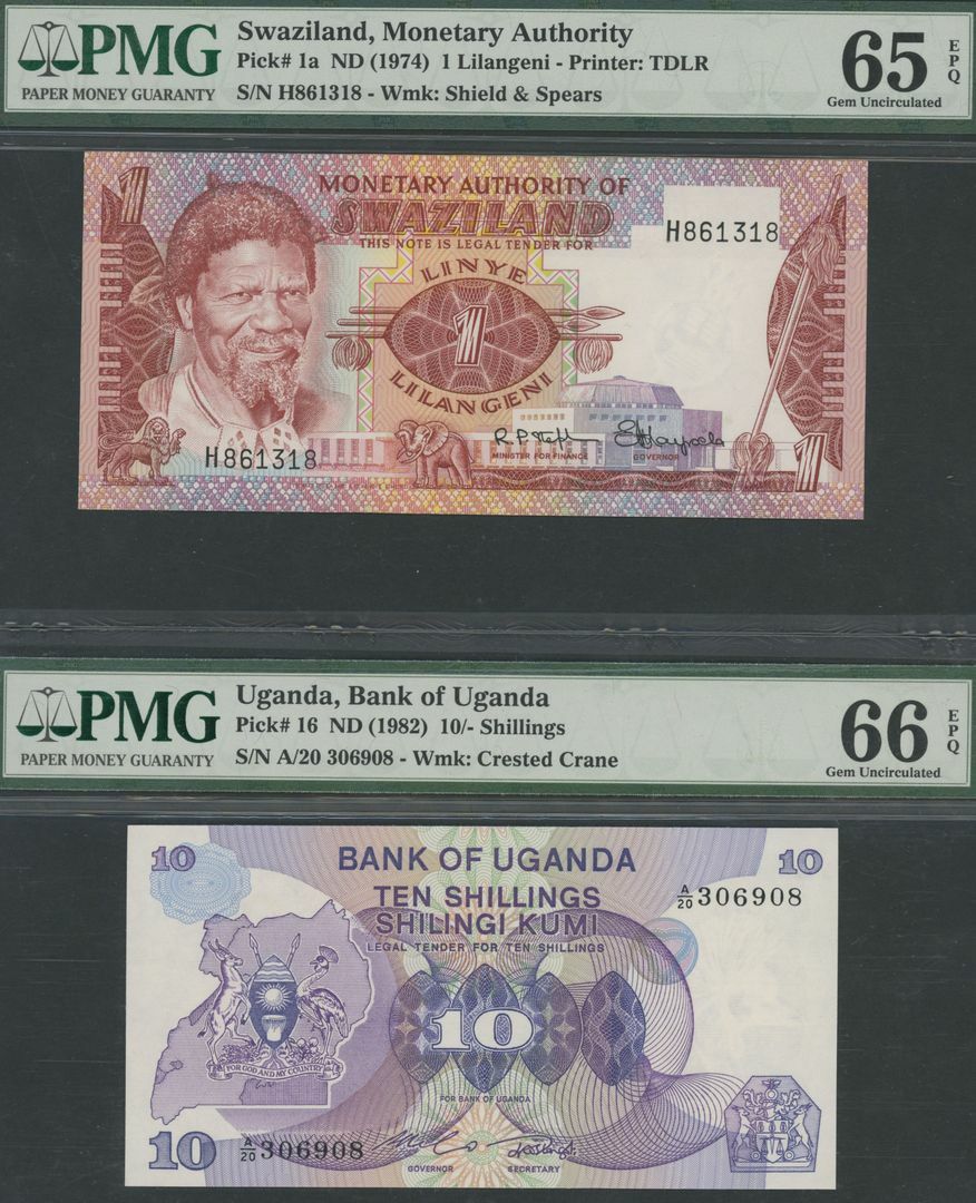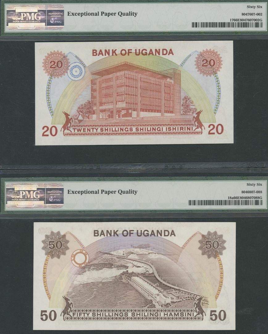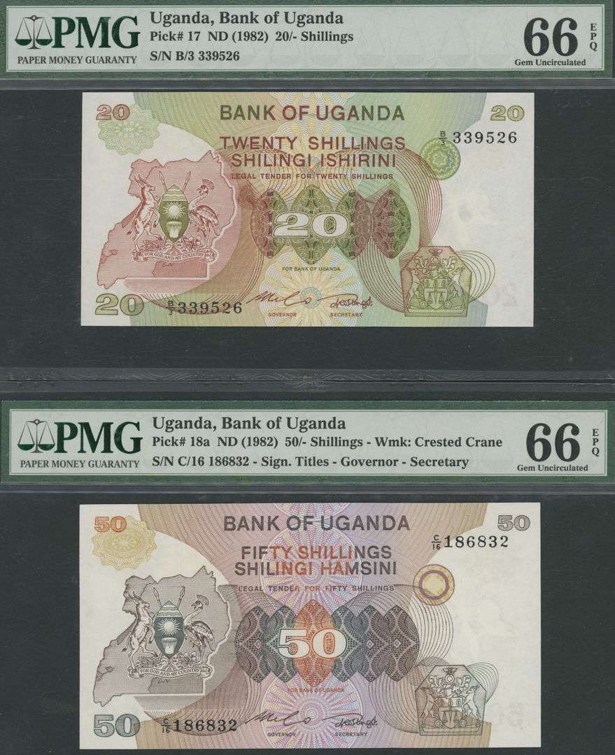 Uganda (4), 10 /-, ND (1982), serial number A/20 306908, 20 /-, ND (1982), serial number B/3 339526, 50 /-, ND (1982), serial number C/16 186832, 50 /-, ND (1985), serial number C/4 469322