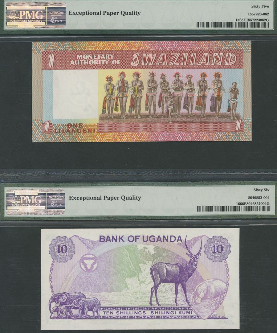 (Pick 135a, 137, 116, 7a, 1a, 16, 17, 18a, 20), mostly in PMG holders 55 EPQ About Uncirculated to 66 EPQ Gem Uncirculated, one note in PCGS holder 65 PPQ Gem Uncirculated (9 notes)