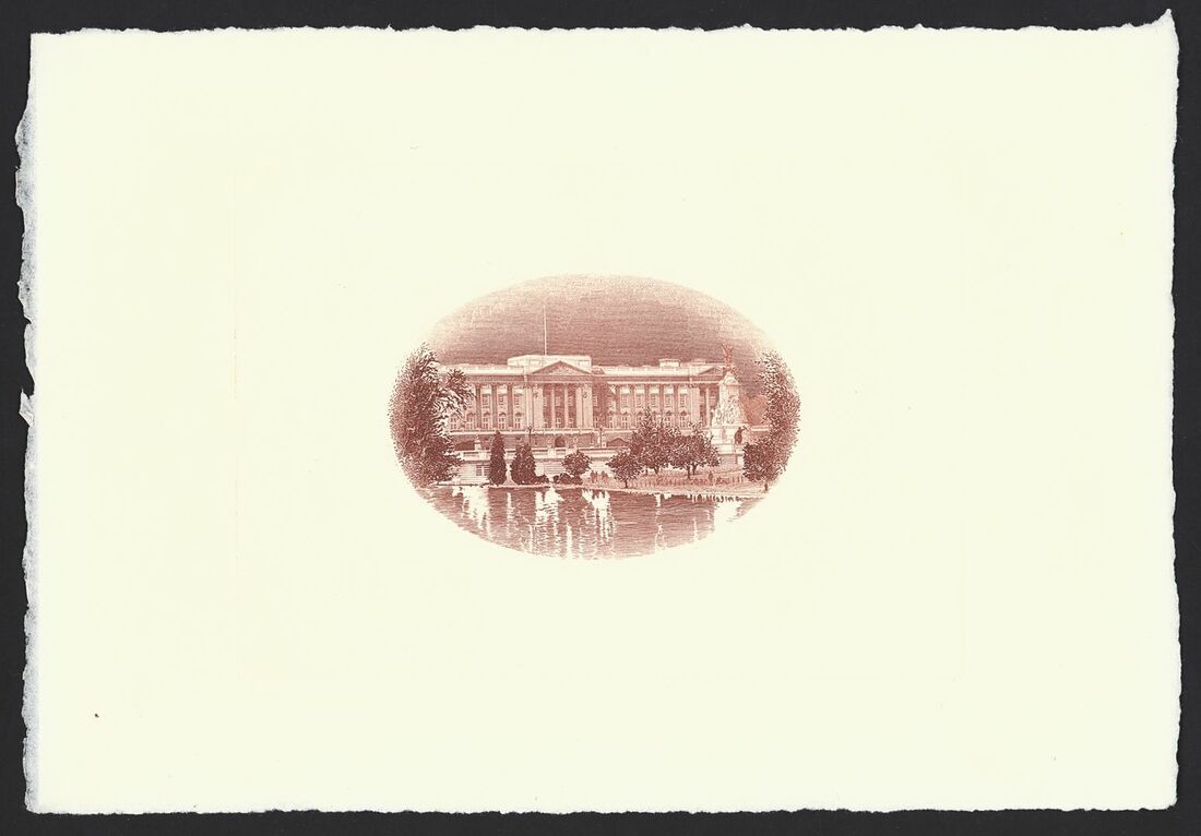 Buckingham Palace Vignette, beautiful brown vignette print of the view of Buckingham Palace from St. James Park, as made