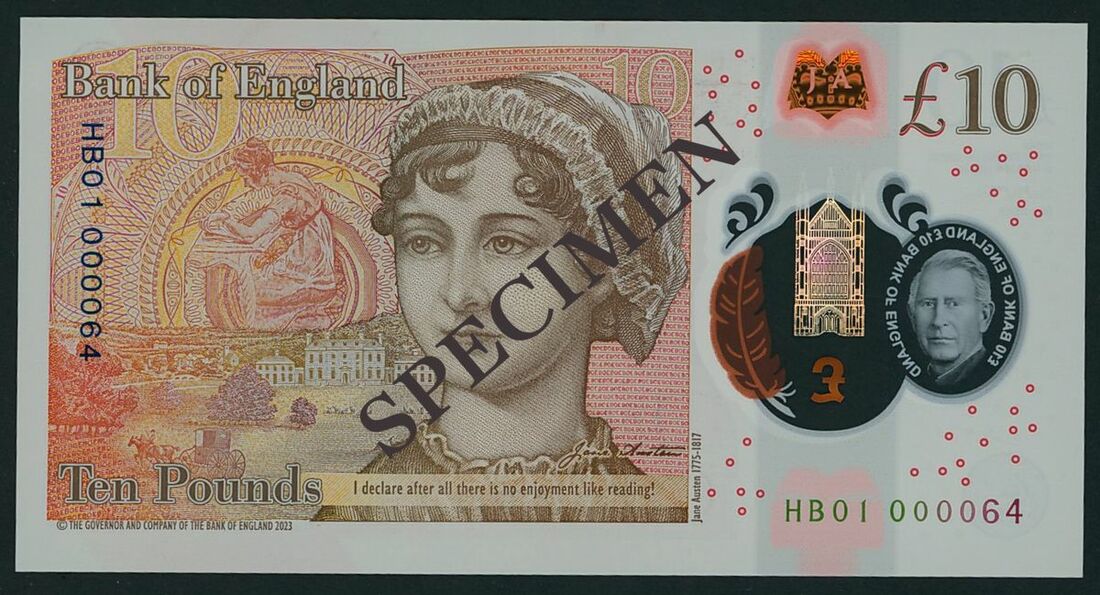 Bank of England, Sarah John, polymer £10, 5 June 2024, serial number HB01 000064, orange-brown, King Charles III at right and in a transparent window at left with text £10 BANK OF ENGLAND. Winchester Cathedral in gold also appears over the window. To the right of Winchester Cathedral is a quill, which shows as orange or purple depending on the angle of view. Reverse, orange-brown, a portrait of Jane Austen. To her left is an illustration of Elizabeth Bennet, the central character in 'Pride and Prejudice'.