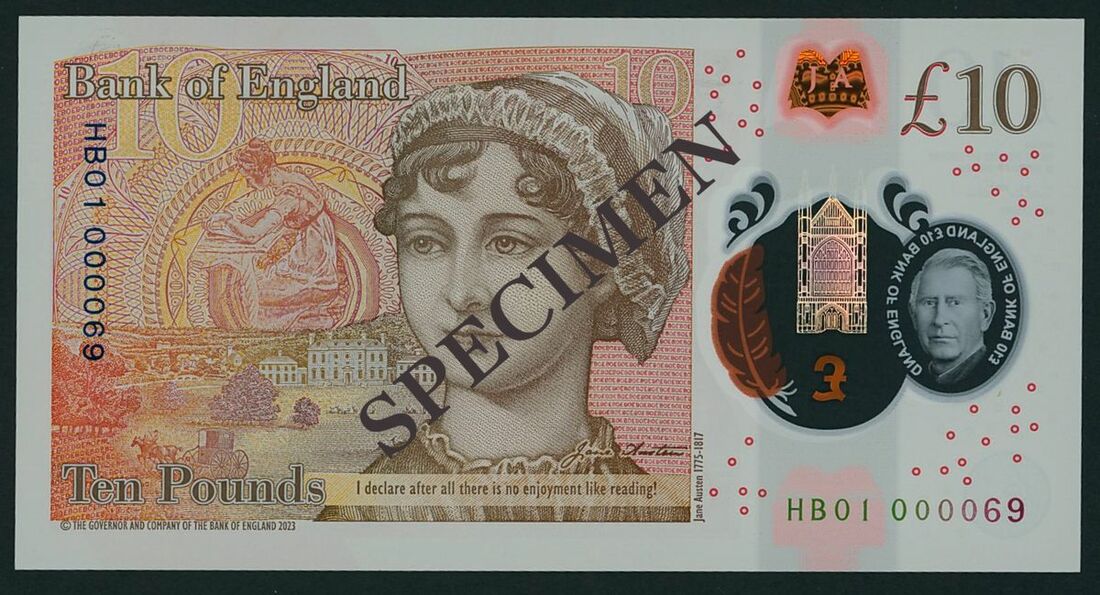 Bank of England, Sarah John, polymer £10, 5 June 2024, serial number HB01 000069, orange-brown, King Charles III at right and in a transparent window at left with text £10 BANK OF ENGLAND. Winchester Cathedral in gold also appears over the window. To the right of Winchester Cathedral is a quill, which shows as orange or purple depending on the angle of view. Reverse, orange-brown, a portrait of Jane Austen. To her left is an illustration of Elizabeth Bennet, the central character in 'Pride and Prejudice'.