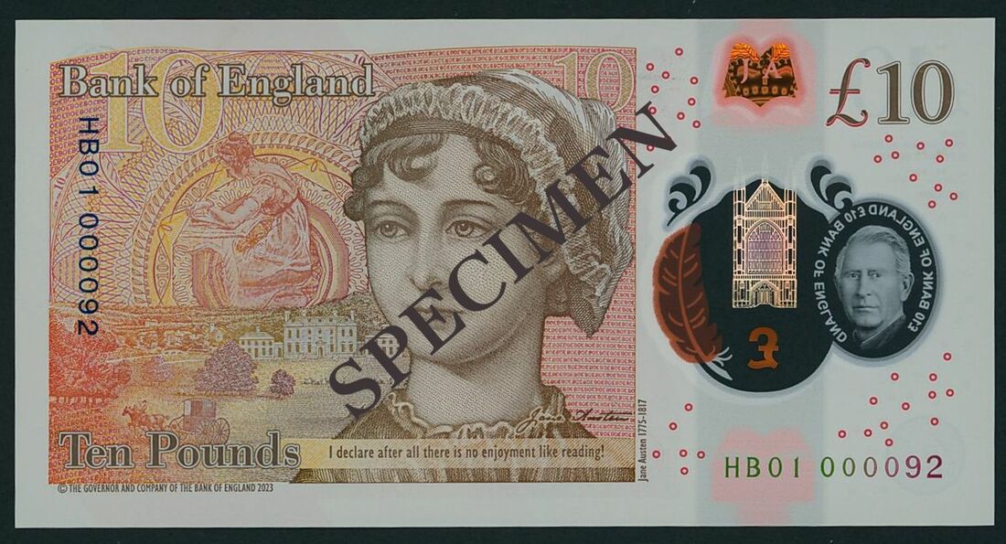 Bank of England, Sarah John, polymer £10, 5 June 2024, serial number HB01 000092, orange-brown, King Charles III at right and in a transparent window at left with text £10 BANK OF ENGLAND. Winchester Cathedral in gold also appears over the window. To the right of Winchester Cathedral is a quill, which shows as orange or purple depending on the angle of view. Reverse, orange-brown, a portrait of Jane Austen. To her left is an illustration of Elizabeth Bennet, the central character in 'Pride and Prejudice'.