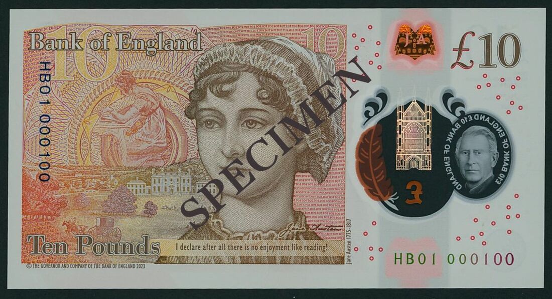 Bank of England, Sarah John, polymer £10, 5 June 2024, serial number HB01 000100, orange-brown, King Charles III at right and in a transparent window at left with text £10 BANK OF ENGLAND. Winchester Cathedral in gold also appears over the window. To the right of Winchester Cathedral is a quill, which shows as orange or purple depending on the angle of view. Reverse, orange-brown, a portrait of Jane Austen. To her left is an illustration of Elizabeth Bennet, the central character in 'Pride and Prejudice'.