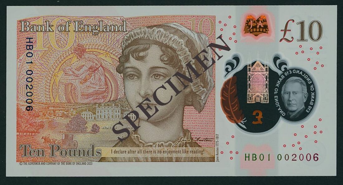 Bank of England, Sarah John, polymer £10, 5 June 2024, serial number HB01 002006, orange-brown, King Charles III at right and in a transparent window at left with text £10 BANK OF ENGLAND. Winchester Cathedral in gold also appears over the window. To the right of Winchester Cathedral is a quill, which shows as orange or purple depending on the angle of view. Reverse, orange-brown, a portrait of Jane Austen. To her left is an illustration of Elizabeth Bennet, the central character in 'Pride and Prejudice'.