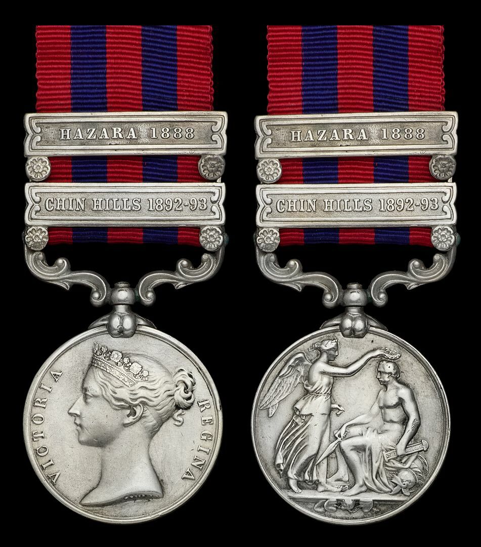 India General Service 1854-95, 2 clasps, Chin Hills 1892-93, Hazara 1888 (1018 Sepoy Mir Jaman 4th Punjab Infy), suspension slightly slack, minor edge bruise, overall very fine