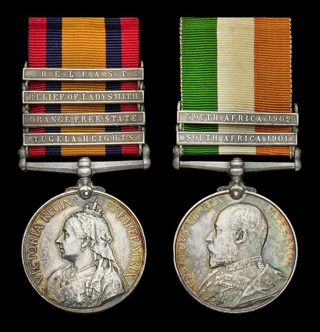 Queen's South Africa 1899-1902, clasps, Tugela Heights, Orange Free State, Relief of Ladysmith, Belfast (2751 Pte C. Cogdell, 2nd E. Surrey Regt); King's South Africa 1901-02, 2 clasps, South Africa 1901, South Africa 1902 (2751 Pte C. Cogdell. E. Surrey Regt), a couple of light edge bruises, otherwise light contact marks, very fine and rare (2)