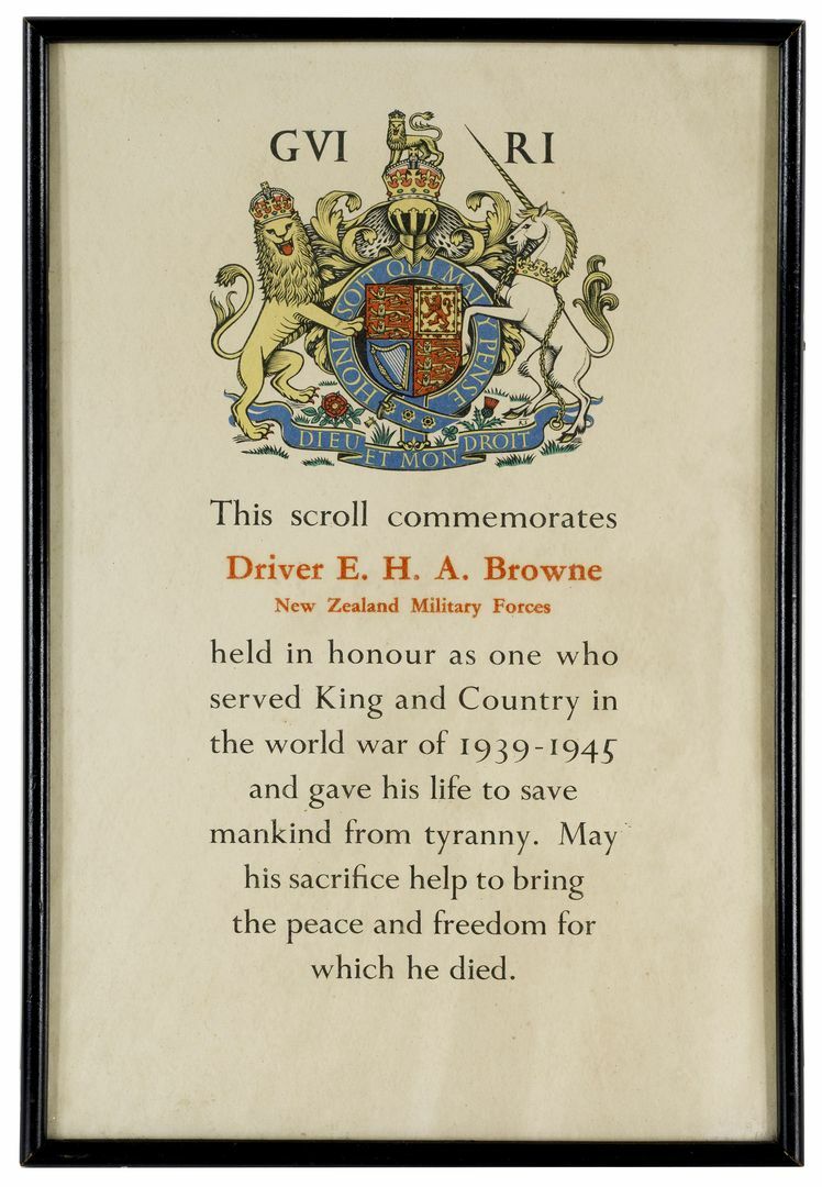 Ernest Hugh Arthur Browne was born at Wellington, New Zealand on 4 January 1921 and was a bacon curer when he enlisted on 30 September 1939. He stated on enlistment that he was born on 4 January 1918, three years earlier than his actual date of birth and also changed his surname from Brown to Browne. He embarked for overseas military service on 5 January 1940 arriving in Egypt the following month, serving in Greece and Crete.