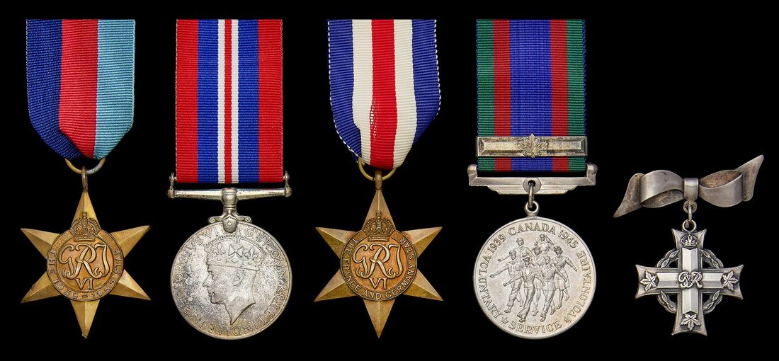 1939-45 Star; France and Germany Star; War Medal 1939-45, Canadian issue; Canadian Voluntary Service Medal 1939-45, with overseas clasp; Canadian Memorial Cross (B.163666 Rfmn. G. Ewoniuk), with adapted silver bow suspension, all awards in their boxes of issue good very fine (5)