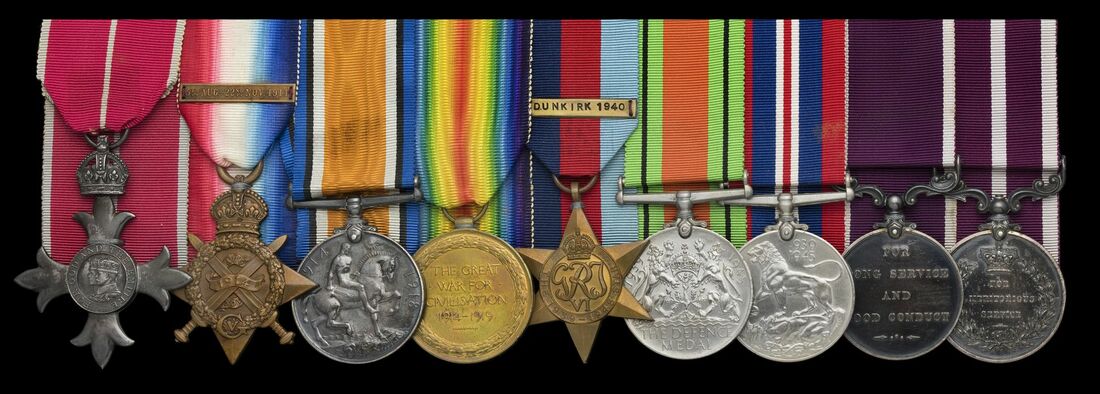 The Most Excellent Order of the British Empire, Military Division (M.B.E.), Member's breast badge; 1914 Star, clasp (65247 Cpl E. J. Godwin. R.F.A.); British War and Victory Medals (65247 W. O. CL.2 E. J. Godwin. R.A.); 1939-1945 Star, with privately made clasp Dunkirk 1940; Defence and War Medal 1939-1945, the three medals privately impressed (Lieut. Q.M. E. J. Godwin M.B.E.); Army L.S. & G.C., G.V.R. (1028415 W.O.CL.II. E. J. Godwin. R.A.); Army Meritorious Service Medal, G.V.R. (65247 B.S.Mjr E. J. Godwin. R.F.A.), small official correction to the surname on the L.S. & G.C., otherwise very fine (9)