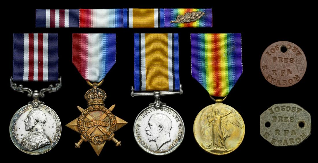 Military Medal, G.V.R. (105037 Bmbr. E. G. Fearon. R.F.A.); 1914-15 Star (105037 Dvr. E. G. Fearon. R.F.A.); British War and Victory Medals (105037 Bmbr. E. G. Fearon. R.A.), minor stains to reverse of Star & VM, otherwise good very fine (4)