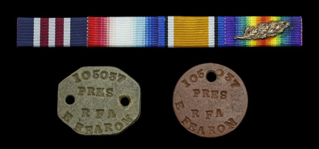 Edward Gordon Fearon was born at Toronto, Canada in 1897 and upon the outbreak of the Great War was a steward living at Montrose Avenue, Toronto. He travelled to England and enlisted in the Royal Field Artillery at Liverpool on 12 August 1915. Having served in France from 14 December 1915, he was decorated for his work attached to the 9th Trench Mortar Battery. Discharged on 14 June 1919, Fearon was still awaiting passage home to Canada in August 1919 and had to appeal to the authorities to get home; sold together with his two pressed card identity tags.