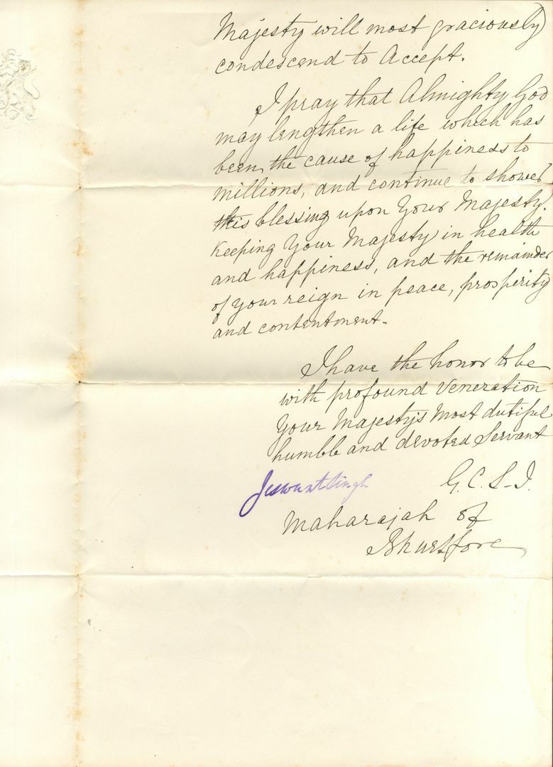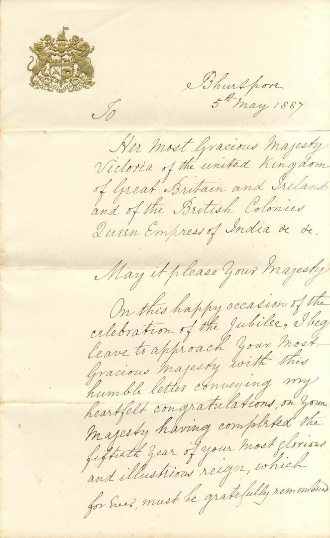 (ii) Letter of congratulations for the 1887 Jubilee from the Maharaja of Bhartpur, 5 May 1887.