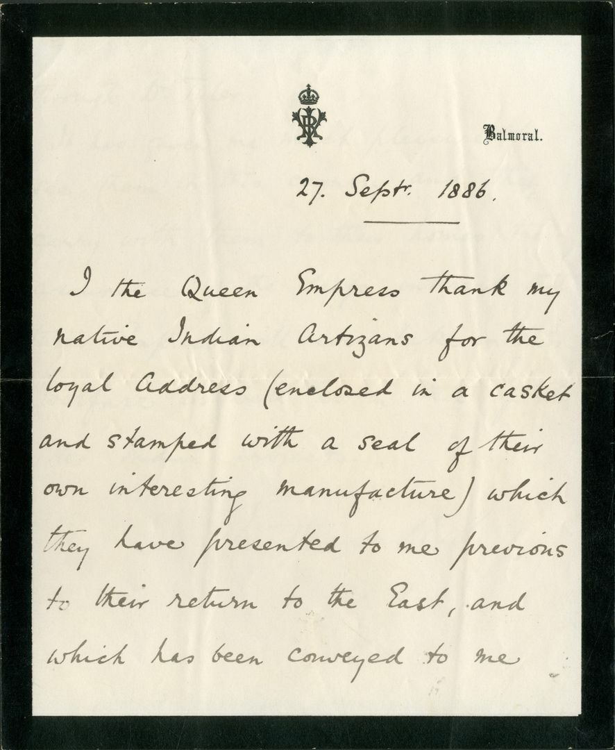 (iii) Letter of thanks from Queen Victoria, from Balmoral, 27 September 1886, related to the presentation gift from 'Dr Tylers Artisans'.