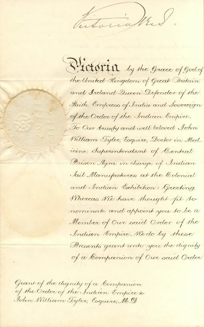 The Queen has been graciously pleased to give directions for the preparation of a Special Statute...to provide for the admission into the said Order of such persons as have rendered special and important services in connection with the Exhibition of the Products, Manufactures, and Arts of Her Colonial and Indian Dominions now being held in London, and to ordain that all persons upon whom Her Majesty may think fit to confer the honour of being admitted into the said Most Honourable Order...John William Tyler, Esq., M.D., Superintendent of Central Prison, Agra, in charge of Indian Jail Manufactures at the Colonial and Indian