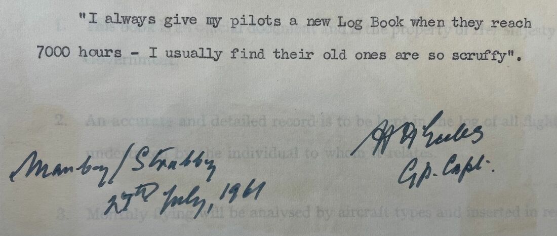 Sold with the recipient's original Flying Log Books for the periods March 1943, January 1950, and August 1961-June 1962. The second begins with the - perhaps diversionary - note stating 'I always like to give my Pilots a few Log Book when they reach 7000 hours - I usually find their old ones are so scruffy.'