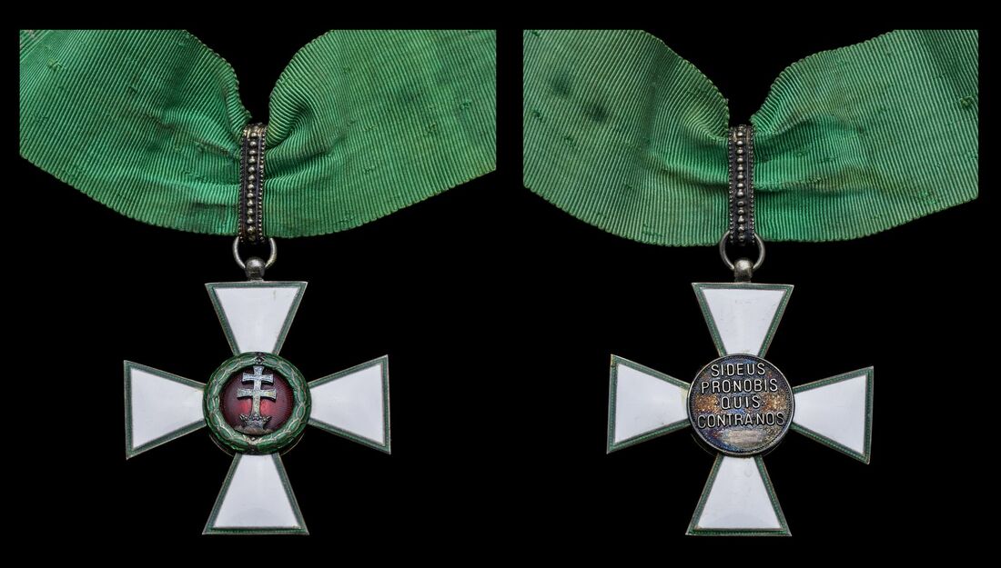(x) Hungary, Regency, Order of Merit, neck Badge, 53mm, silver-gilt and enamel, maker's initials 'BG' between rays, reverse centre sometime re-affixed, very fine, with full neck riband with fittings as worn