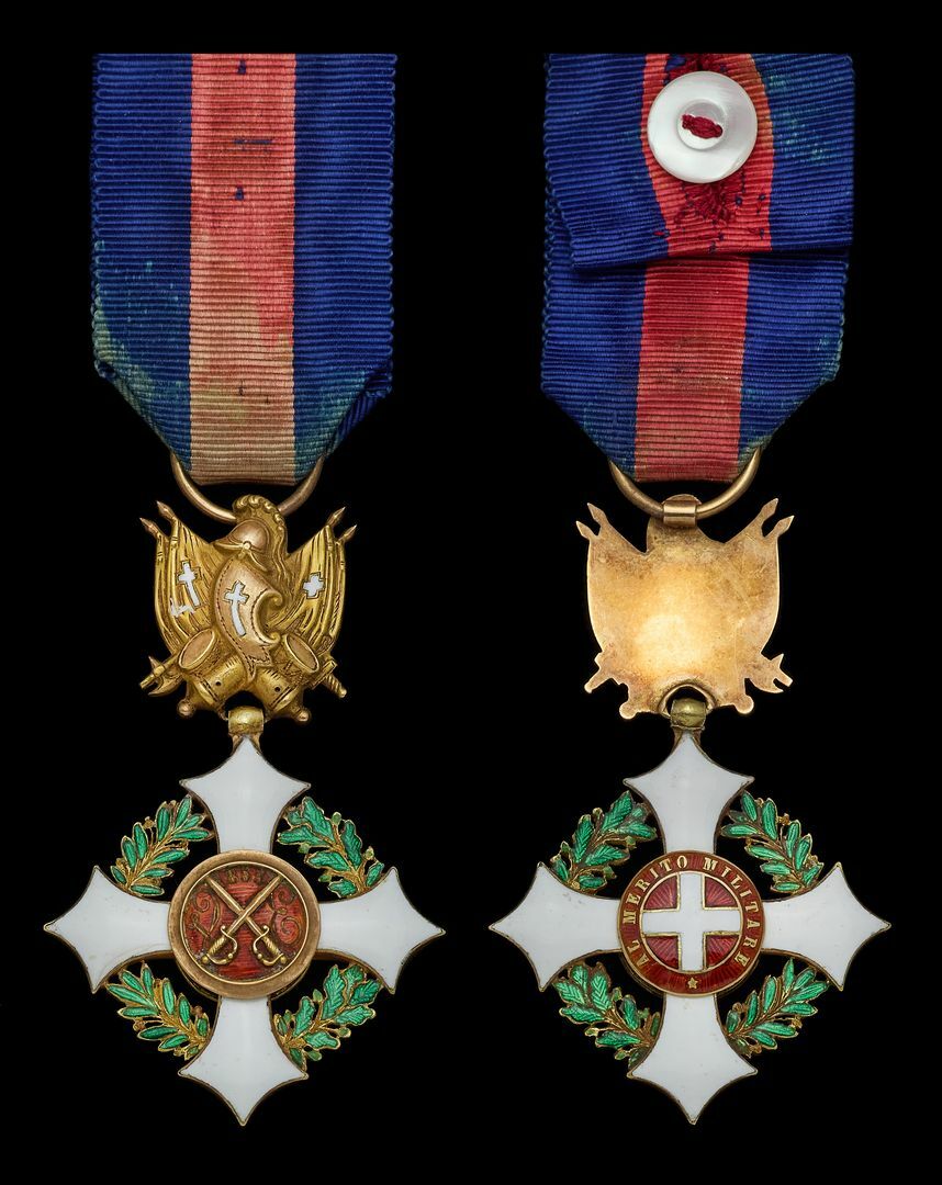 (x) Italy, Savoy, Military Order of Savoy, Knight's breast Badge, 60mm including trophy of arms suspension x 37mm, gold and enamel, very fine, with button-hole fitting for wear
