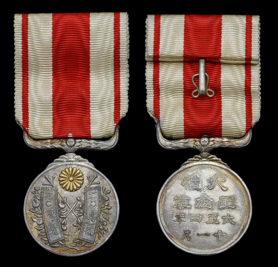 Japan Empire, A Taisho Enthronement Commemorative Medal 1915, in silver with gilt chrysanthemum, on original ribbon with hook and eye, and housed in wooden box of issue, lightly toned, extremely fine
