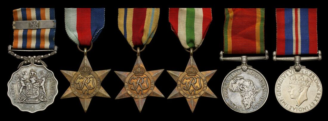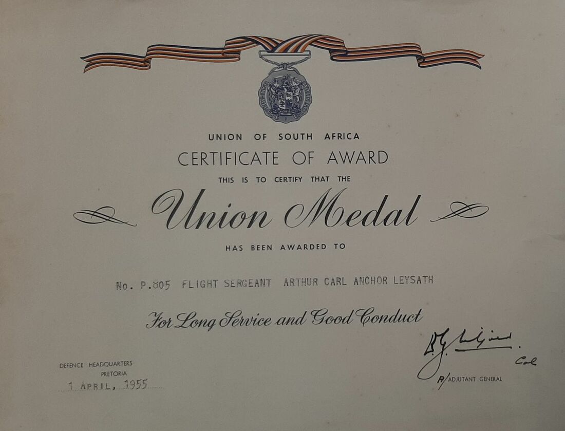 (x) The South Africa Union Medal and Bar group awarded to W.O.1. A.C.A. Leysath, South African Air Force