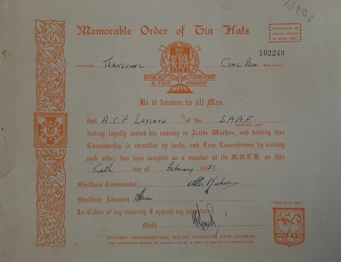 The Memorable Order of Tin Hats (M.O.T.H.) was founded in 1927 by Charles Evenden as a brotherhood of South African former front-line soldiers. The ideal is to help comrades in need, either financially or physically; and to remember all servicemen who have answered the Sunset Call, both in war and peacetime.