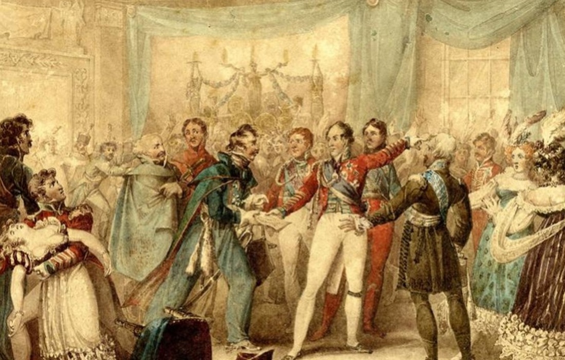 Interestingly, Robinson was the only officer of the 32nd Regiment to receive an invitation to the Duchess of Richmond's Ball. Held in a Brussels coach-maker's workshop on the night of 15 June 1815, it has famously gone down in history for its subsequent (and perhaps rather romanticised) depictions in later paintings and stories, and being grandly portrayed on screen in the major motion picture Waterloo (1970). Whilst reality was somewhat different, nevertheless a large number of extremely important and well-connected individuals attended (not least the Duke of Wellington and the Prince of Orange). It must still have been a glittering occasion, certainly the event of the 'Season', but one which would probably not have been nearly as well remembered today had it not been dramatically interrupted by Napoleon's advance into Belgium.