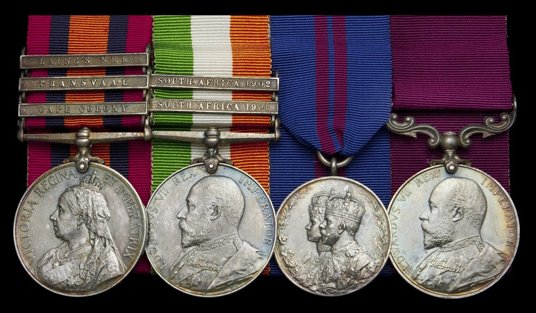 Queen's South Africa 1899-1902, 3 clasps, Cape Colony, Transvaal, Laing's Nek (69111 Sgt. E. A. Catherall, 2nd W.D., R.G.A.); King's South Africa, 2 clasps, South Africa 1901, South Africa 1902 (69111 Serjt: E. A. Catherall. R.G.A.); Coronation 1911 (No. 69111. C.Q.M.S. E. Catherall. R.G.A.), privately engraved in upright capitals; Army L.S. & G.C., E.VII.R. (69111 C.Q.M.Sjt: E. A. Catherall. R.G.A.), mounted court-style for display, contact marks, very fine (4)