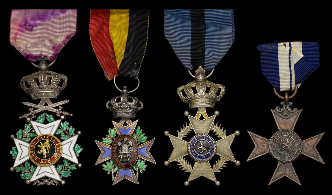 (x) Belgium, Kingdom, Special Decoration for Industry and Agriculture, silver Badge and crown, silver and enamel; Order of Leopold, Knight's breast Badge with swords, Palme upon riband, silver, silver-gilt and enamel; Order of Leopold II, Knight's breast Badge, silver and enamel; Bavaria, Merit Medal, bronze, overall very fine (4)