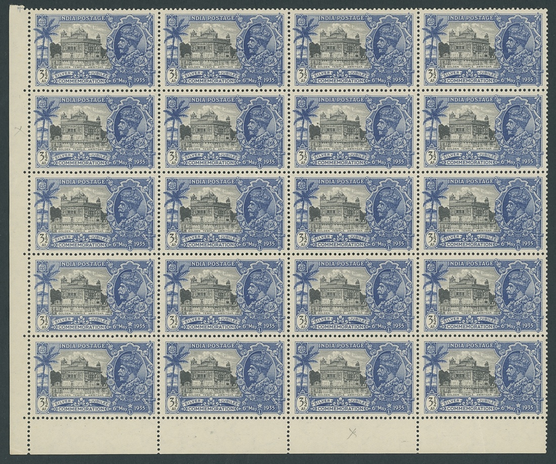 1935 Silver Jubilee 3½a. black and dull ultramarine, lower left block of twenty (4 x 5), [9/3] showing bird flaw, full original gum; fine. S.G. 245, 245a, £546