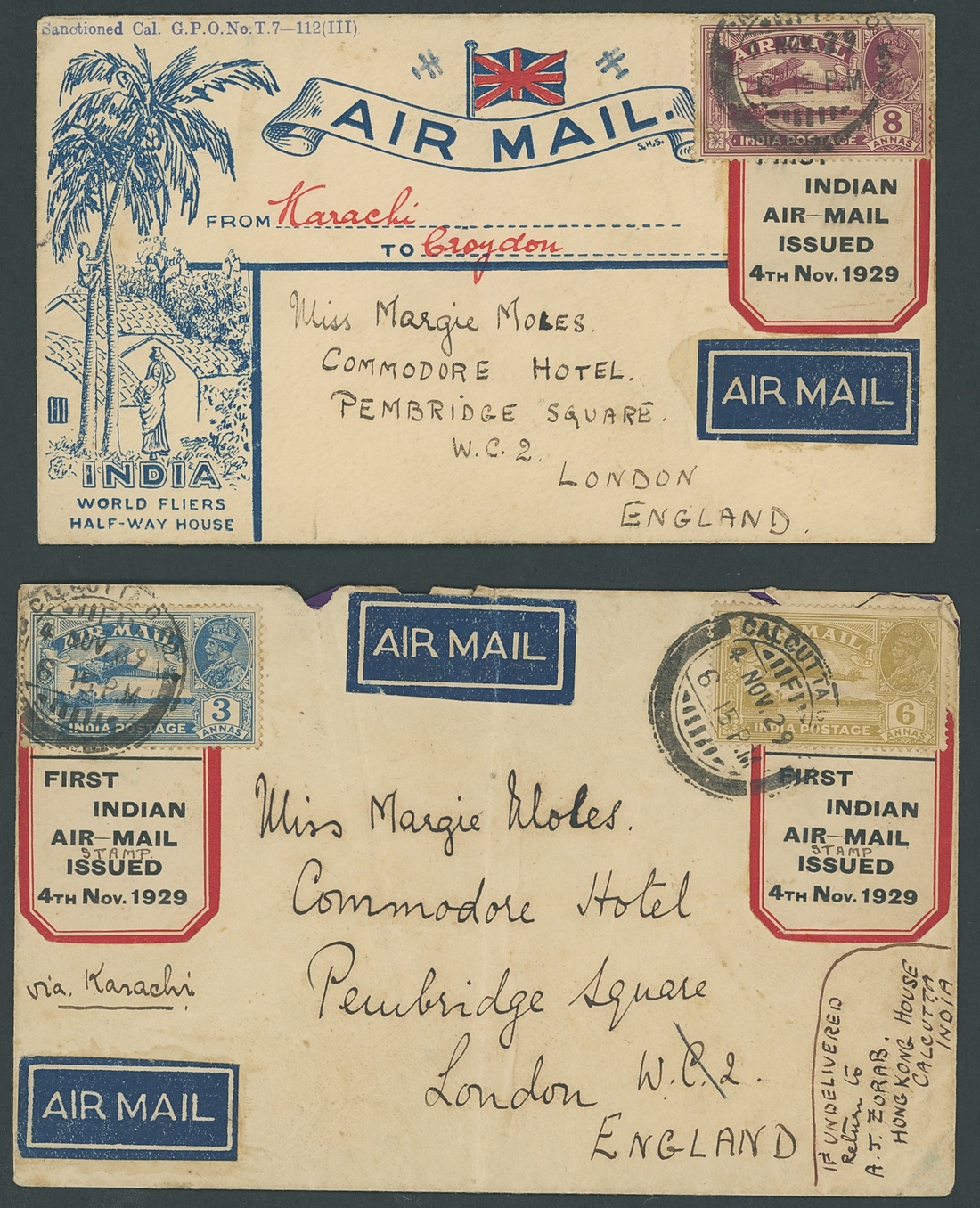 1929 (4 Nov.) First day of Issue illustrated Airmail envelopes (2) both to Miss Margie Moles, the first bearing 3a. and 6a. tied by