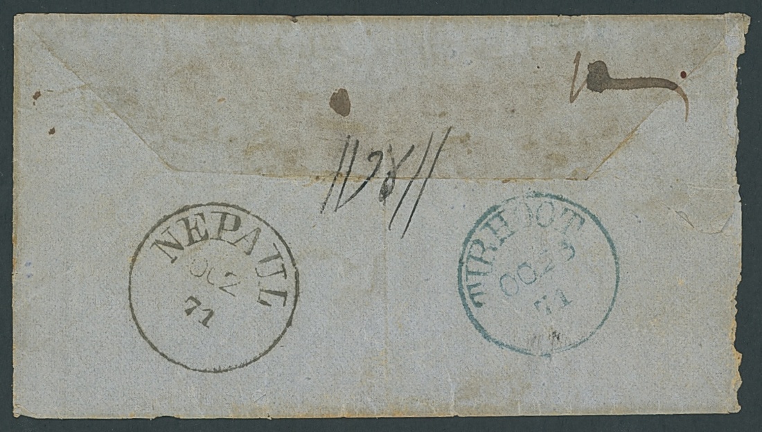 1871 (Oct.) stampless incoming entire from Tirhoot to Nepal with '1a' due mark above, showing a very fine strike of the black