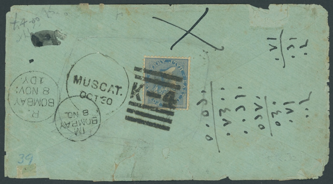 1873 (circa) envelope from Muscat to Bombay franked on the reverse with ½a. blue cancelled by K-4 in five bars duplex obliterator (30.10) with adjacent arrival (8.11) c.d.s. Envelope faulty though rare and very neat strikes.