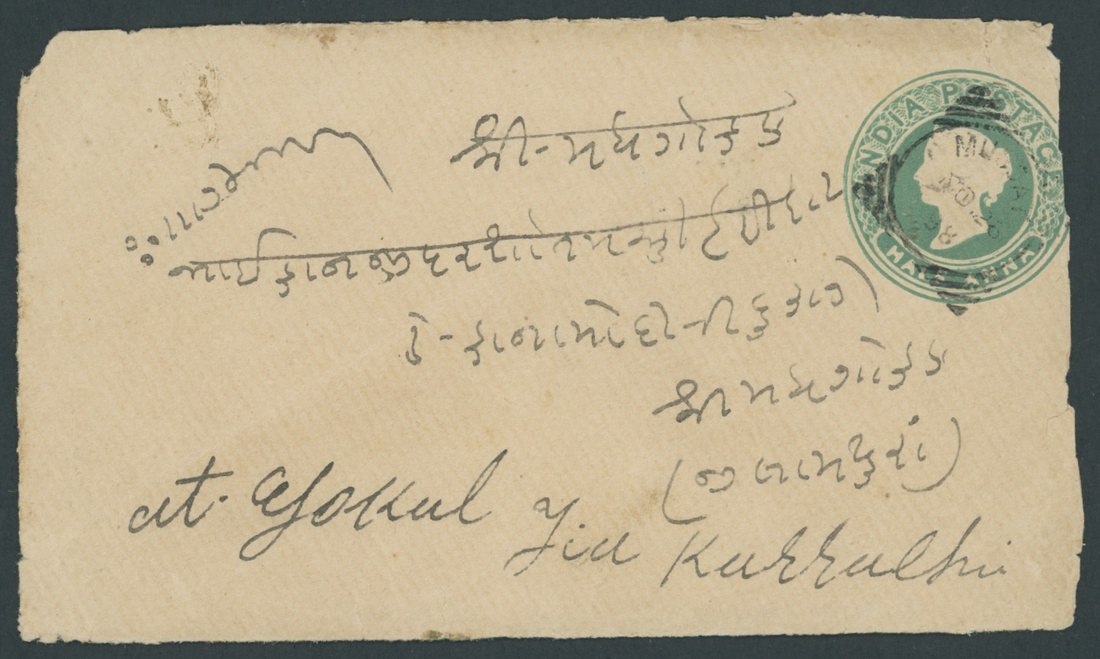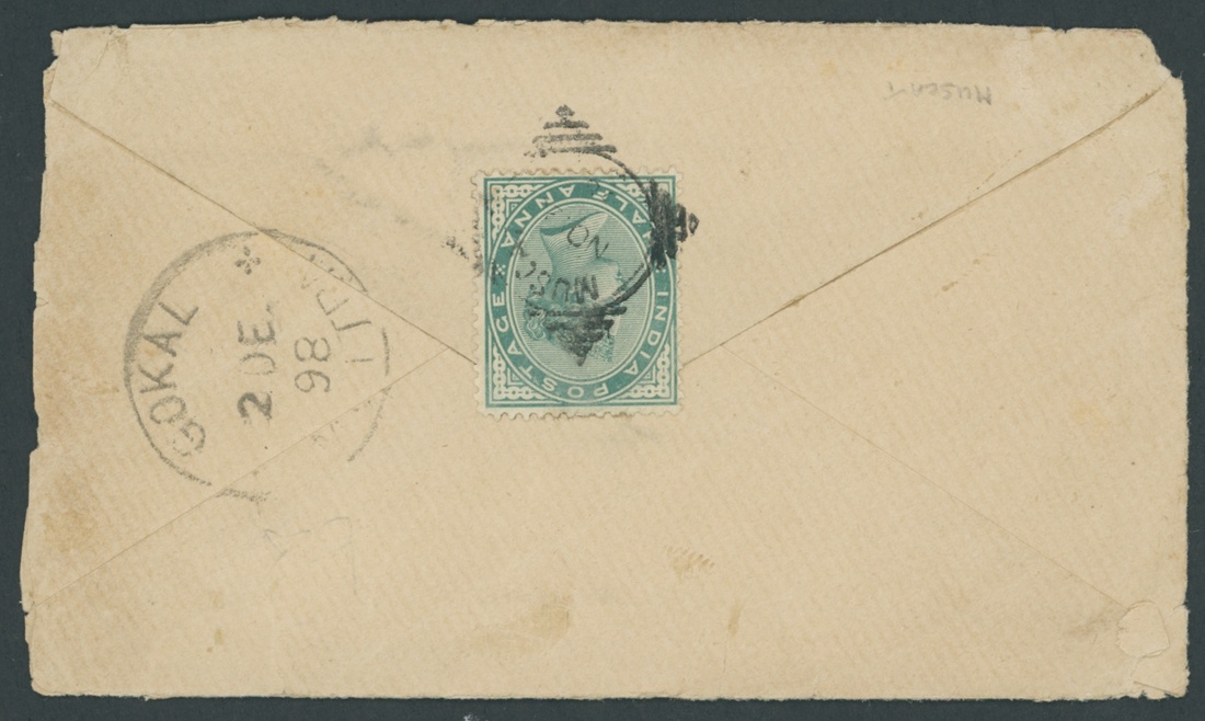 1898 (26 Nov.) ½a. green postal stationery envelope from Muscat addressed to Gokal uprated on reverse with India 1882-90 ½a. tied by despatch squared circle c.d.s., the reverse showing arrival (2.12) c.d.s. Envelope slightly reduced at right and opened for display with some peripheral wear, nevertheless a rare usage of uprated postal stationery. S.G. Z21
