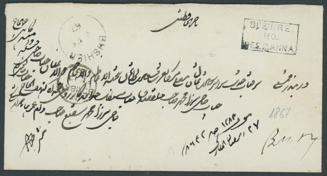1867 (8 Feb.) stampless envelope addressed to Bombay, India showing boxed bushire/p.o./beg 2 anna handstamp with adjacent despatch c.d.s. and arrival (13.2) c.d.s., fine and scarce.