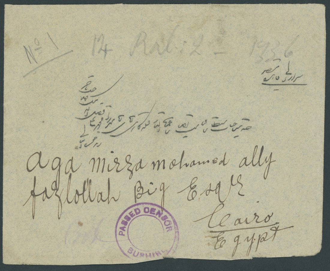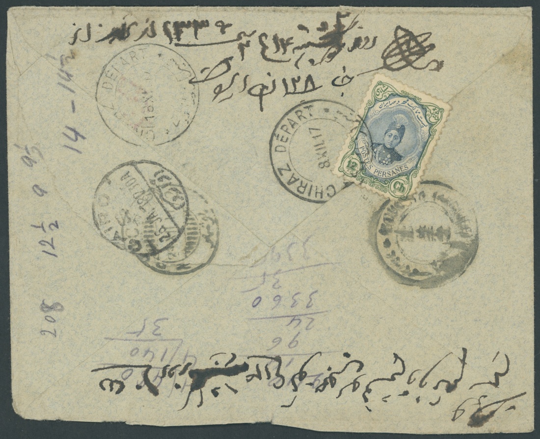 1917 (8.12) envelope from Chiraz (Persia) addressed to Cairo, Egypt franked on the reverse with Persia 12ch. cancelled by despatch c.d.s. and with adjacent arrival (26.1.18) c.d.s. On the front rare