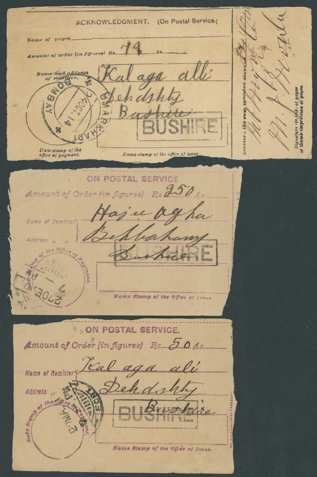 1910-14 a selection of three acknowledgement receipts showing datestamps and boxed