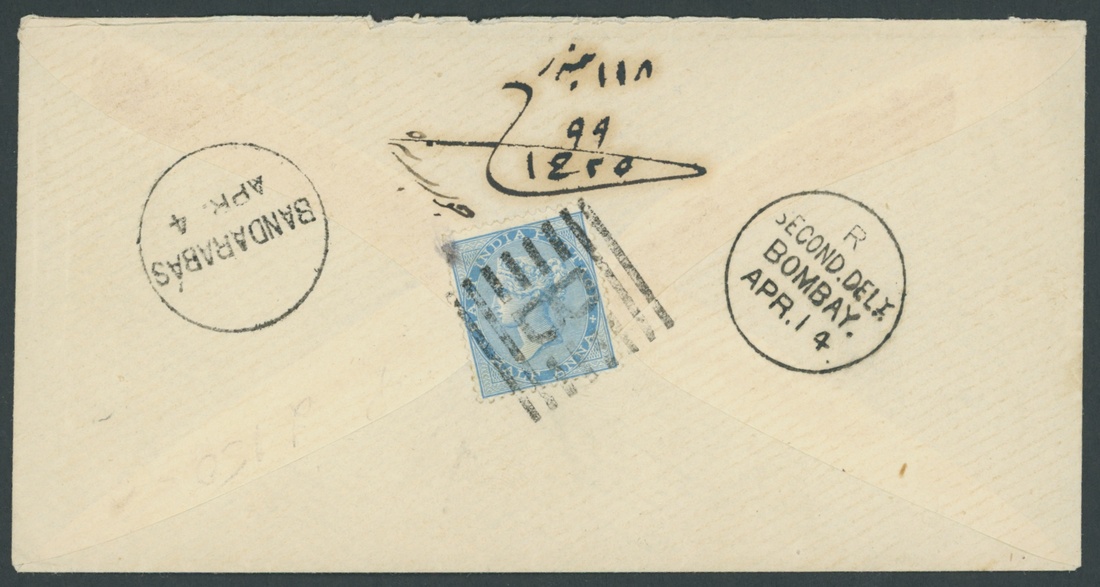 1882 (4 Apr.) envelope from Bandar Abbas addressed to India franked on the reverse with ½a. cancelled by 'B' in eight lines obliterator with adjacent despatch c.d.s and Bombay (14.4) c.d.s. Adhesive faulty at upper left corner though envelope of very fine appearance. S.G. Z46