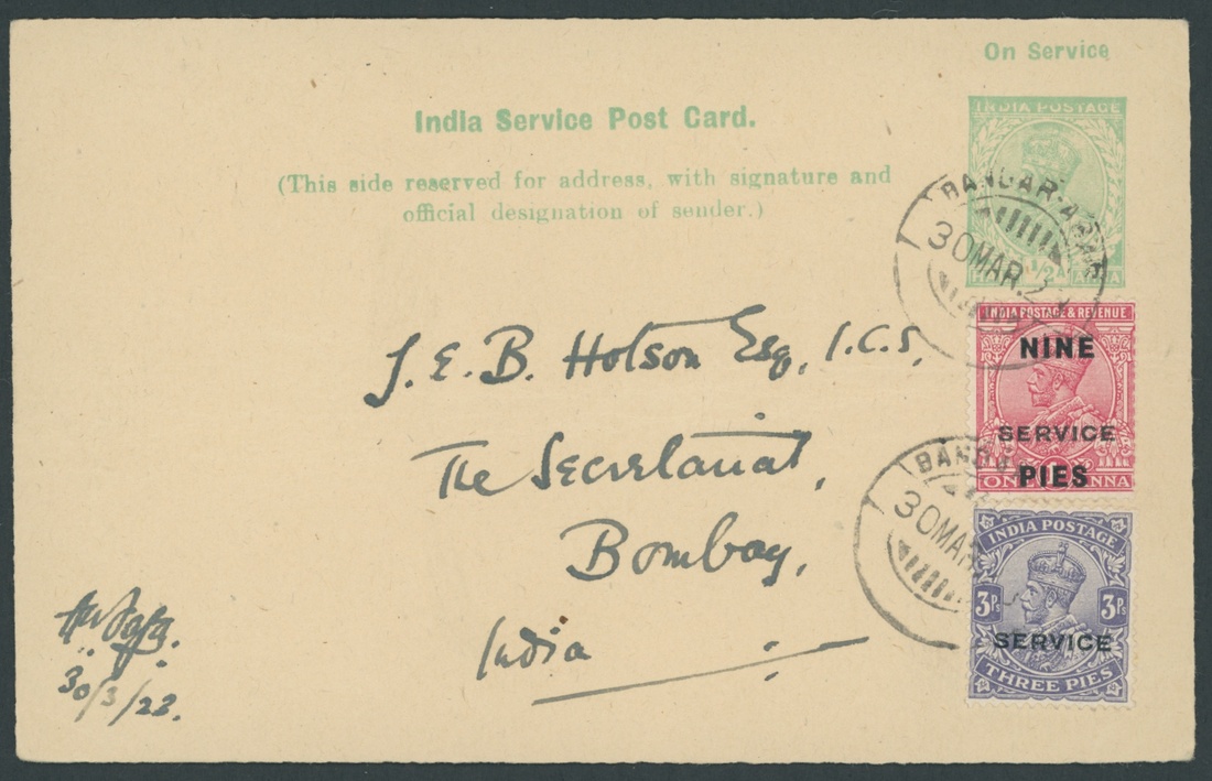 1923 (30 Mar.) ½a. india service post card from Bandar Abbas addressed to Bombay uprated with Officials 3p. and 9p. on 1a. cancelled by despatch c.d.s., card horizontally creased not detracting from the overall appearance. An extremely rare combination. S.G. Z113, Z118
