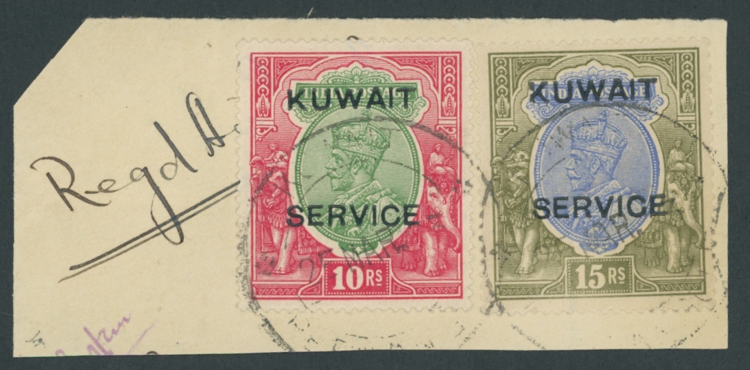 1923-24 10r. green and scarlet and 15r. blue and olive tied on a small registered piece cancelled by