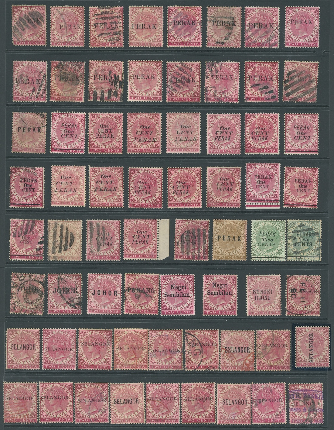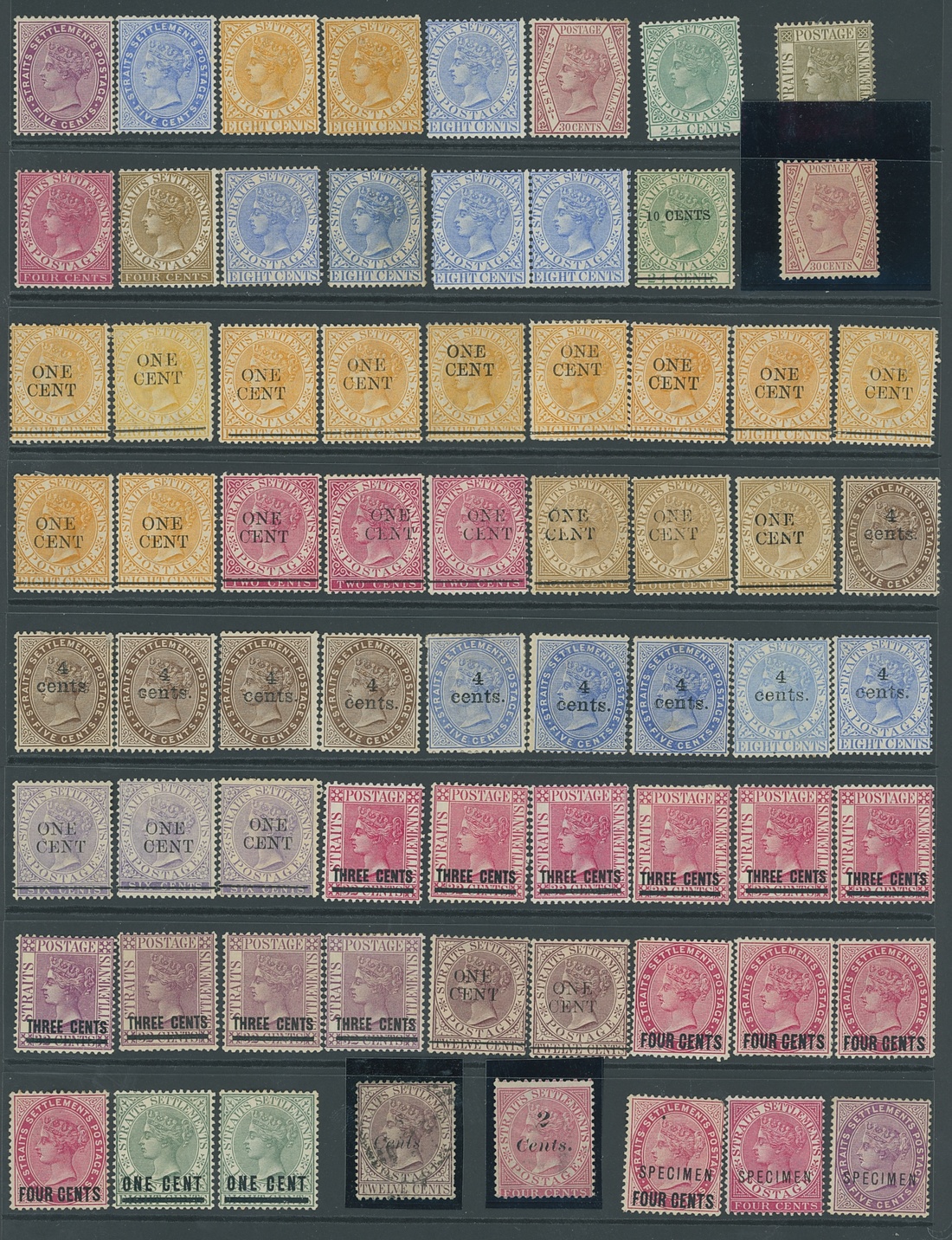 Mint and used selection (130+) on stock pages, including Straits Settlements 1883-91 30c. inverted watermark, 96c. used, 1891 10c. on 24c., 1899 4c. on 5c. "