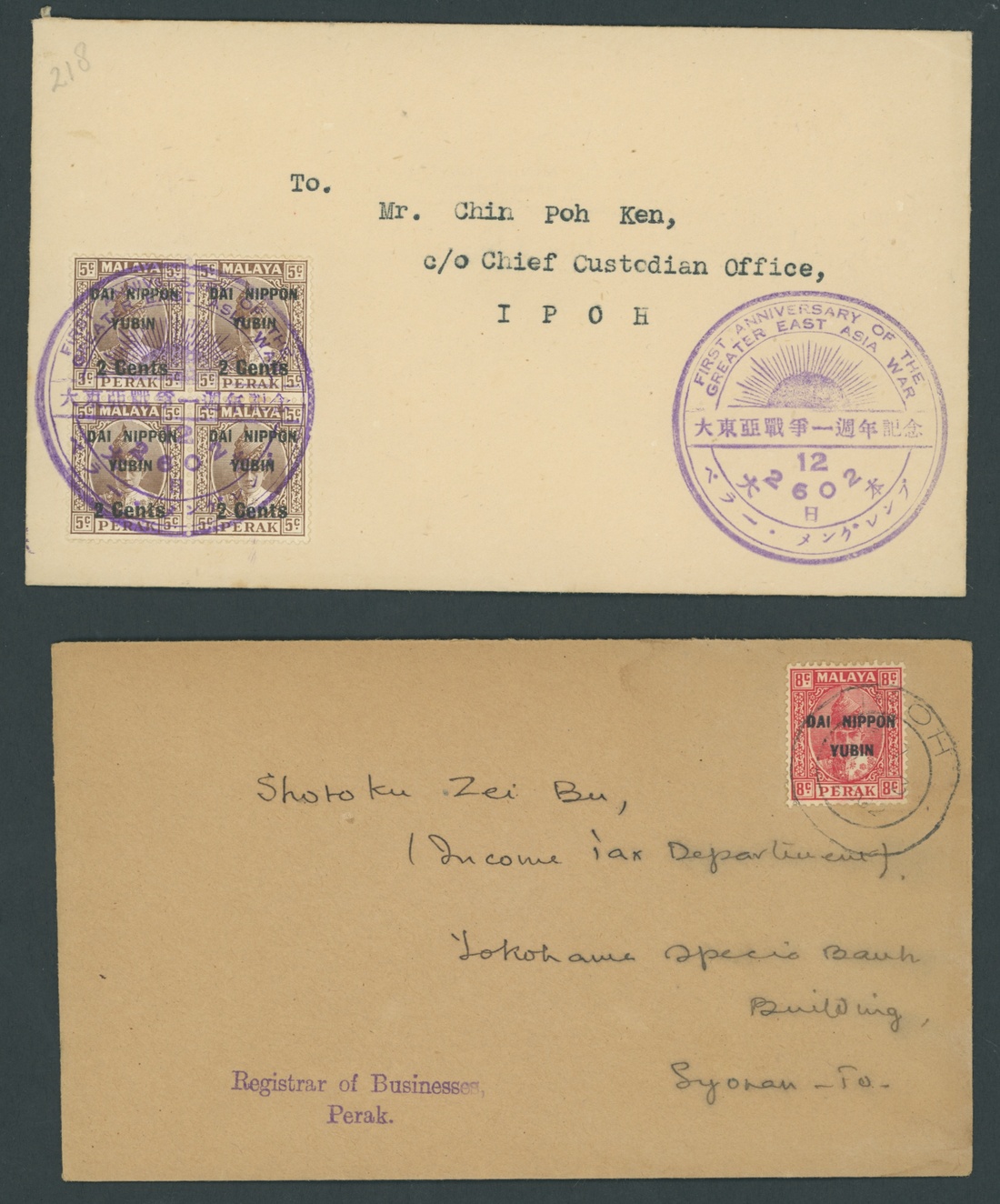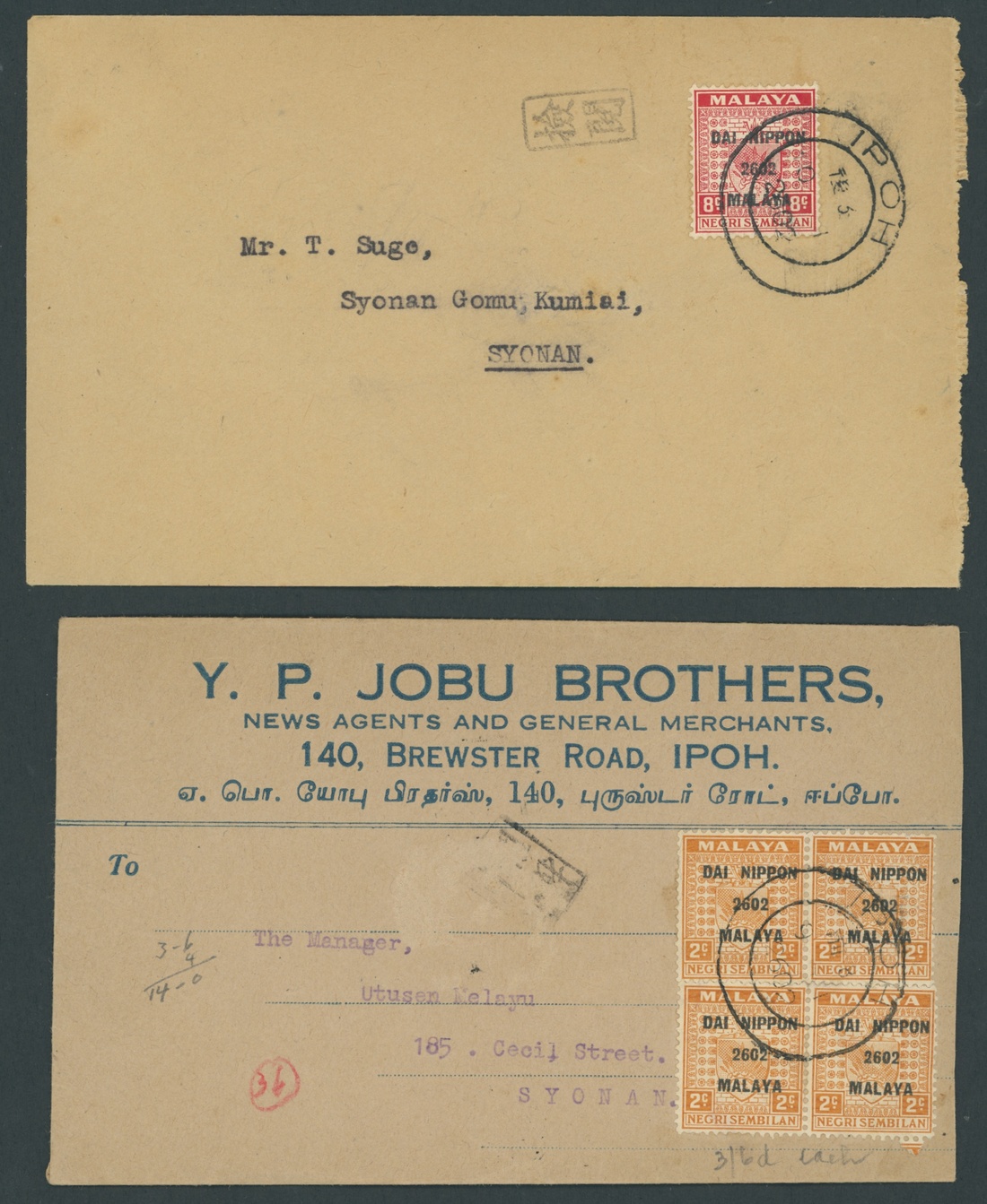 1942 (1 Sept.) Jobu Brothers advertising envelope from Ipoh to Singapore bearing Negri Sembilan 2c. block of four with