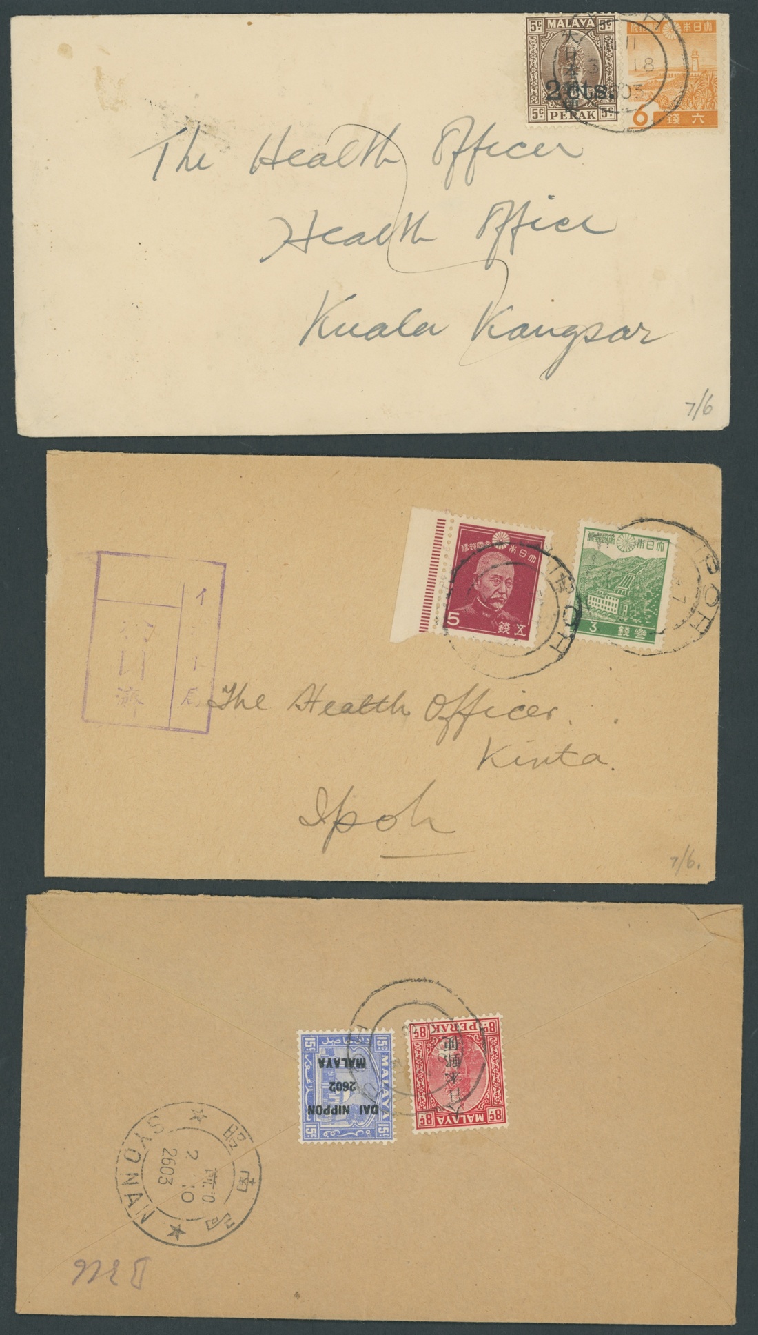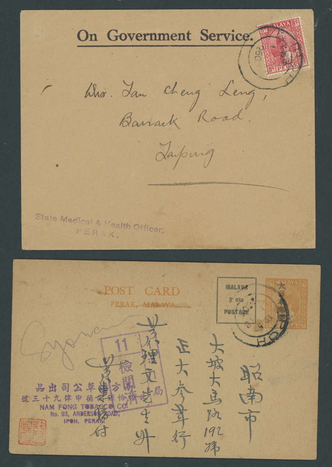 1943 (25 Jan.) OGS envelope from Ipoh to Taiping bearing Perak 8c. with "Kanji" overprint tied by Type D22; 1943 (8 Feb.) envelope registered from Ipoh to Singapore bearing, on reverse, Perak 8c. with "Kanji" overprint and Selangor 15c. with