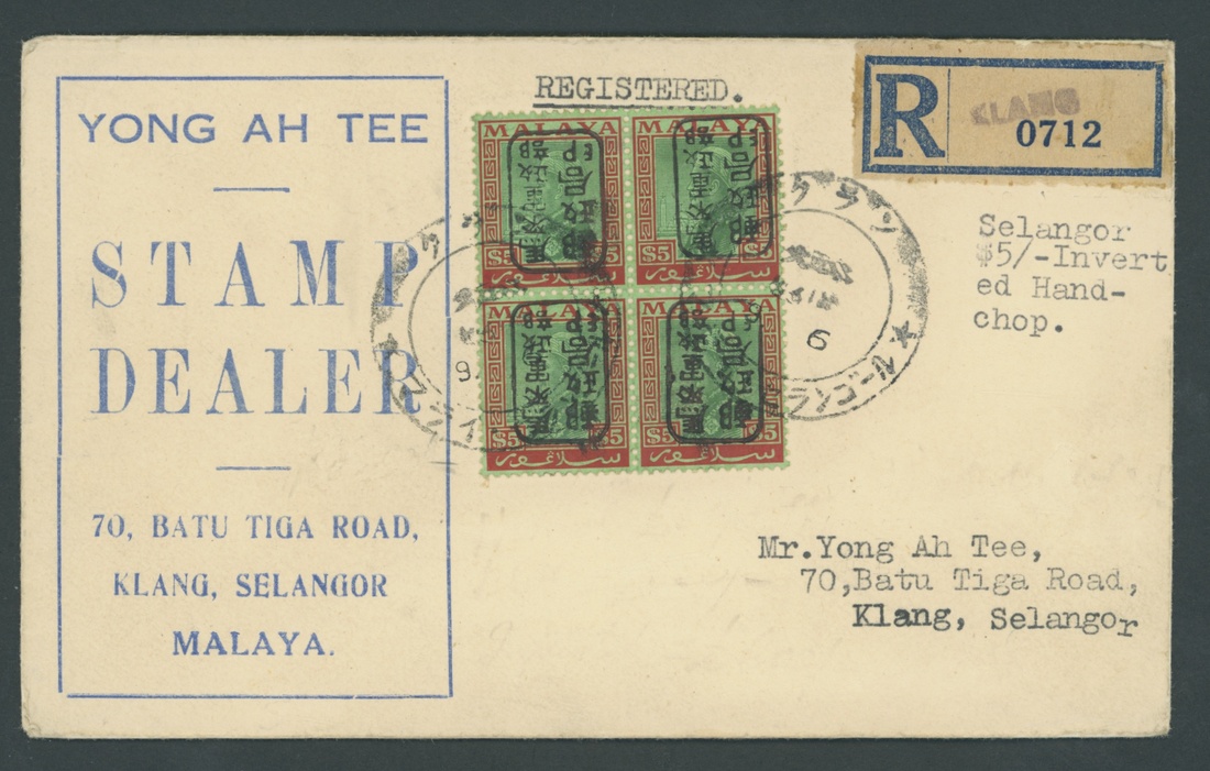 1935-41 $5 green and red on emerald, a block of four with handstamp in black (Type E) inverted on 1943 (6 Sept.) Yong Ah Tee locally addressed and registered envelope at Klang, fine. A great rarity. J.S.C.A. 7M89a, 800,000 Yen (for used).  Photo