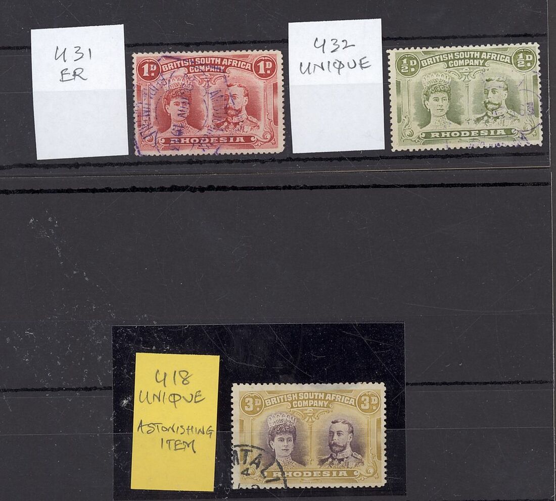 A selection all used in Umtali comprising a partial strike Umtali/Mashonaland distinctive c.d.s. showing code "4" at top, struck on 3d. purple and yellow-ochre, thinned perfs. U18 (unique), also Umtali/Ambulancia Beira 1913, 29 June hexagonal datestamp in violet on 1d. perf.15, U31 (extremely rare) and (9 Feb.) with blank before day on ½d., a light strike, U32 (unique), a rare trio. (3)