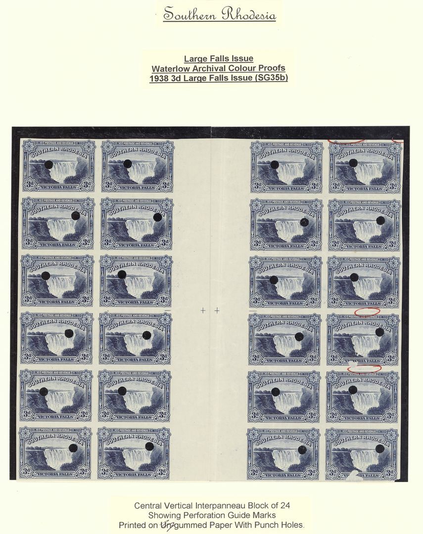 1935-41 Large Falls 3d. deep blue printer's imperforate plate proof interpanneau block of twenty-four (4x6) showing guide crosses at centre and with three stamps ringed for plate correction, each stamp with 4½mm. puncture;  vertical crease at centre and lower right stamp with surface faults though an attractive multiple