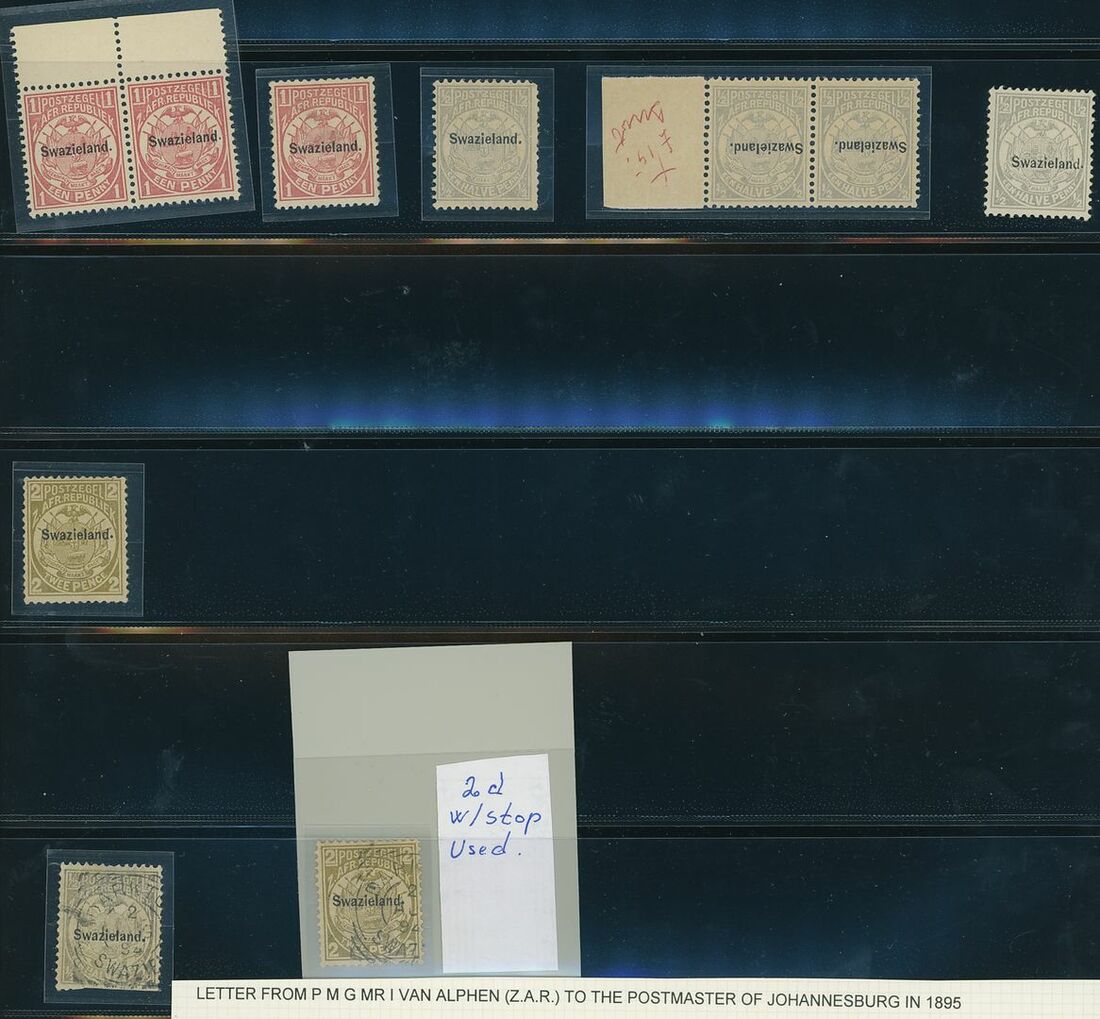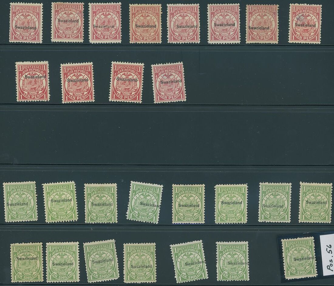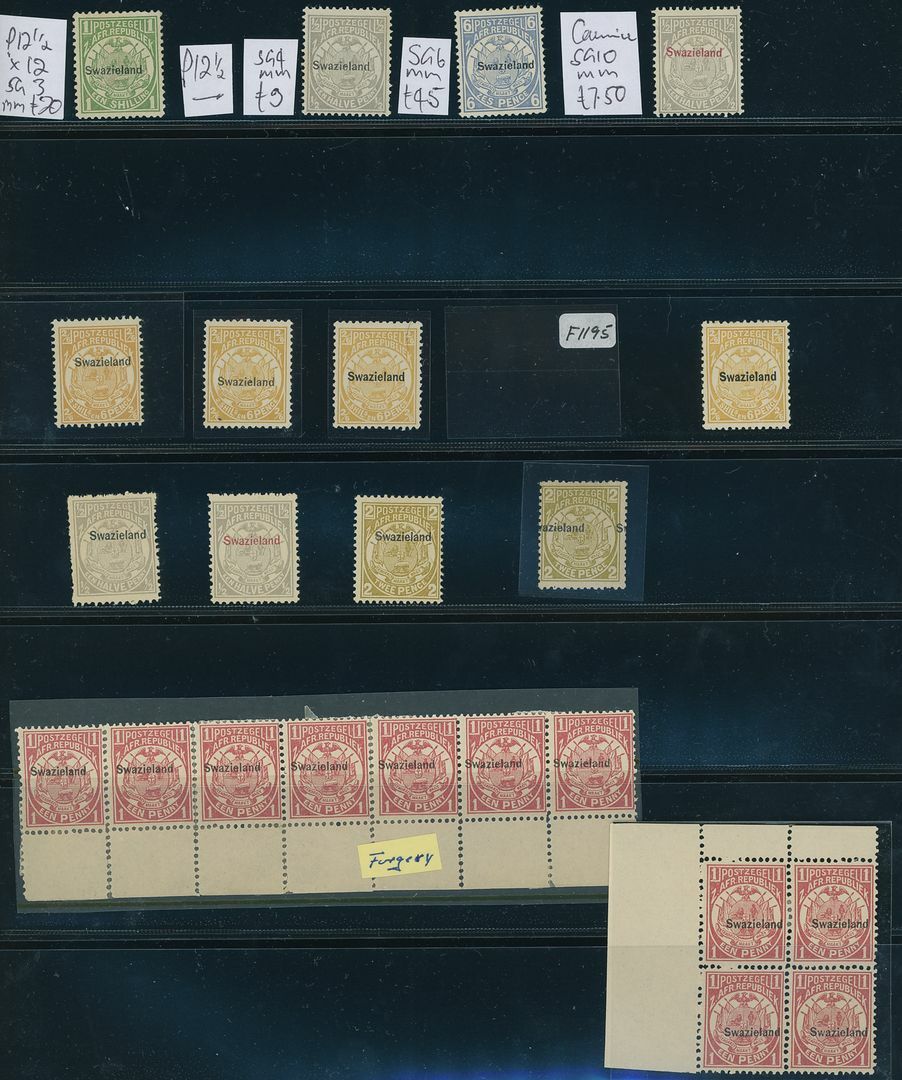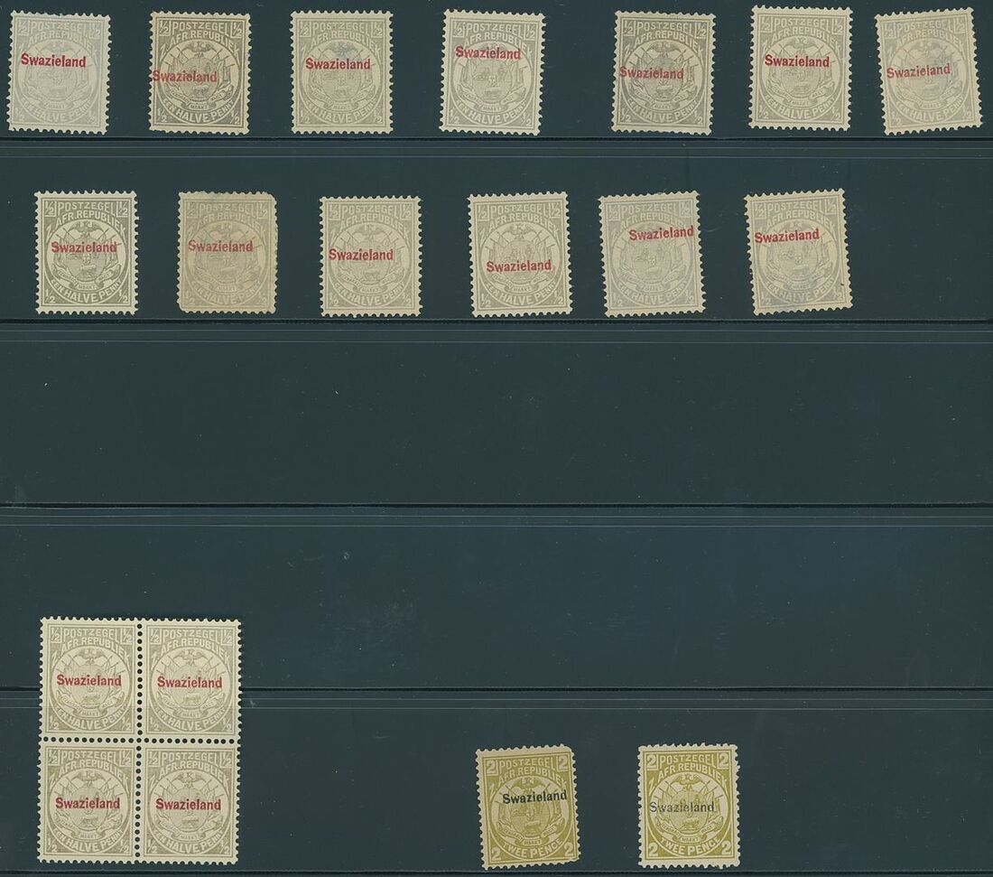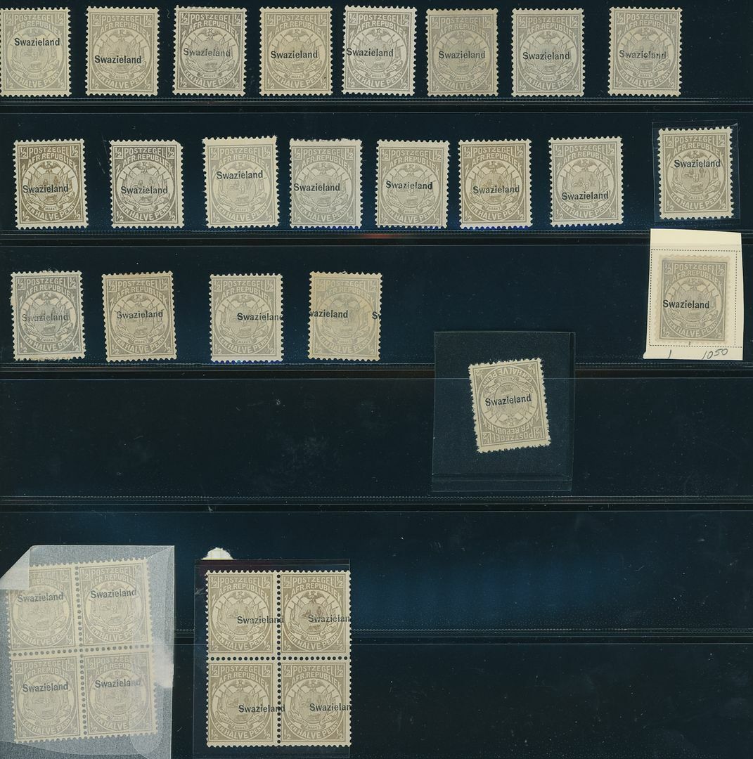 1889-90 and 1892 "Swaziland" overprints on Transvaal, selection (100+) on stock pages, including 1889-90 perf. 12½ ½d. overprint inverted, 2/6d. (3), 1892 red overprint ½d. block of four, with stop ½d. (2 mint and another used, also a pair with inverted overprints), 2d. (mint and used), etc., mixed condition