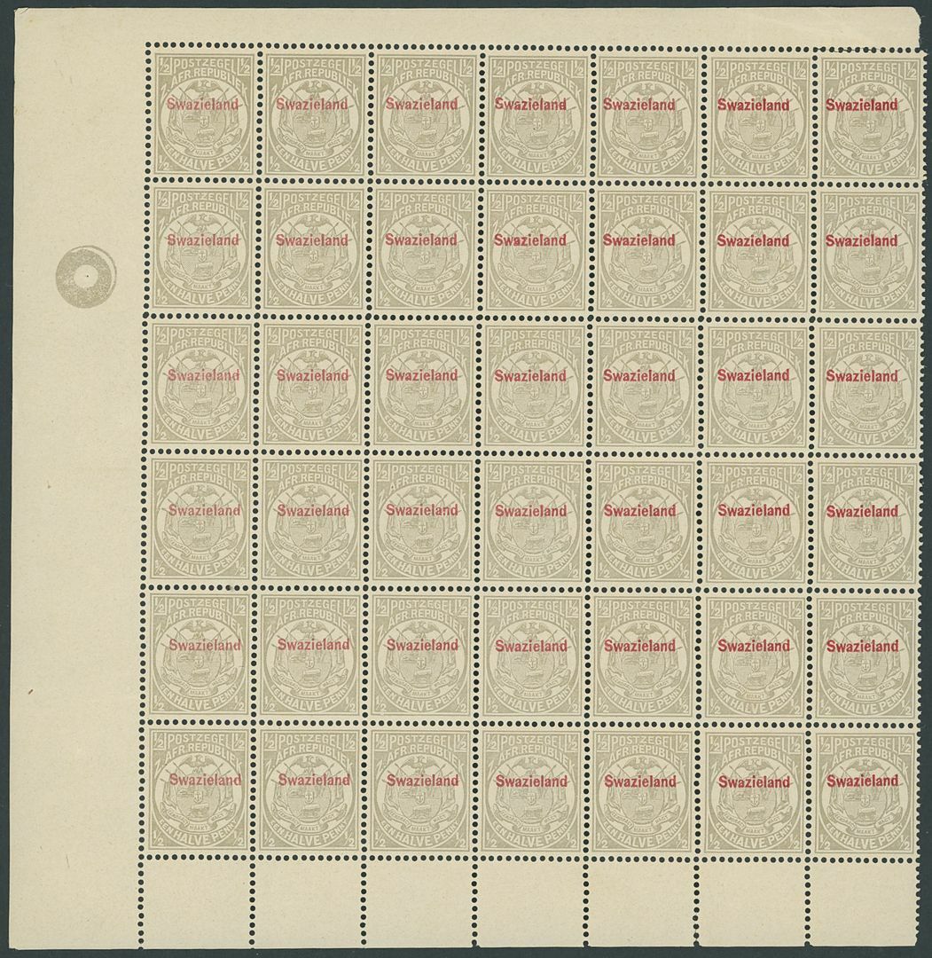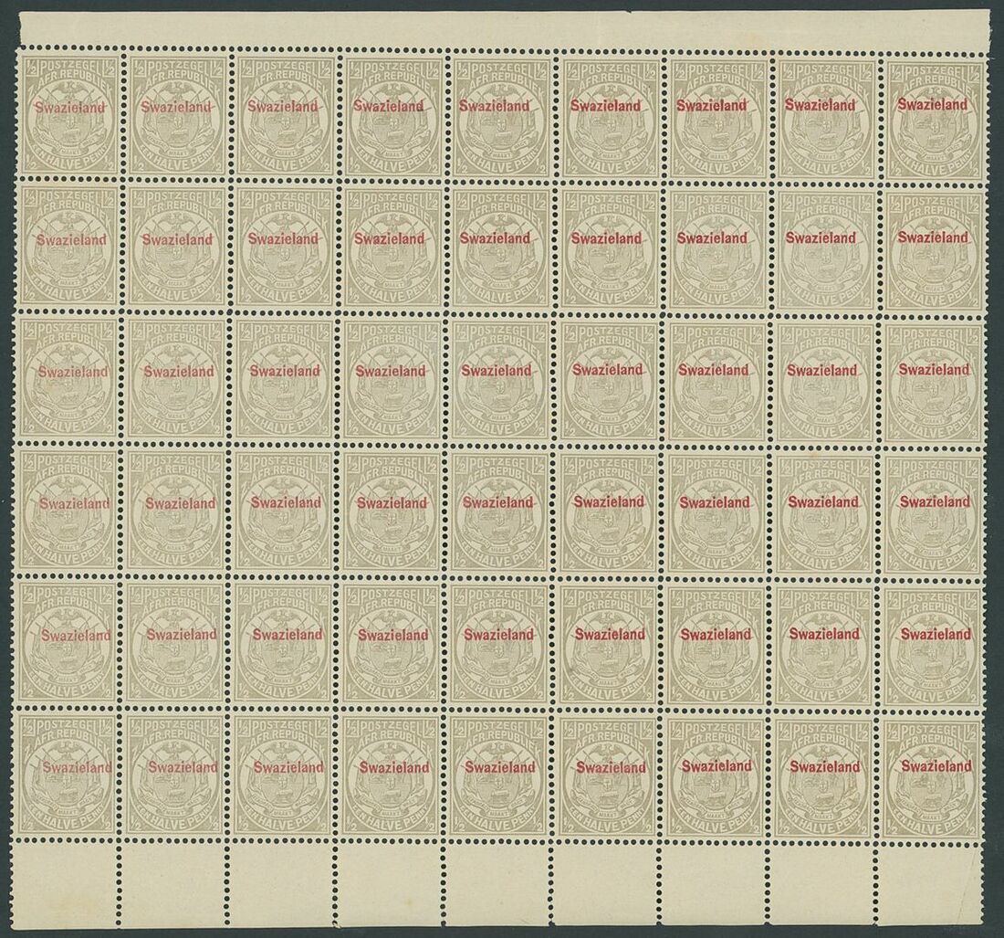 ½d. grey overprinted in carmine, corner block of forty-two and block of fifty-four with margins at top and bottom both showing minor overprint varieties; fine. B.P.A. Certificates (1991) for both. S.G. 10, £960+