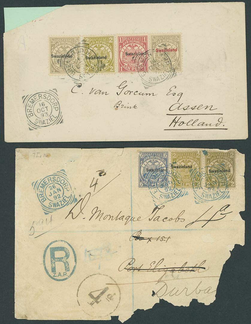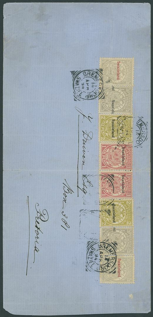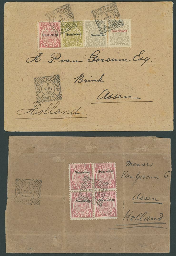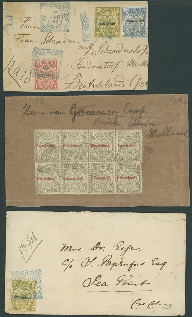 1892-94, selection of seven covers or wrappers and a front. including 1892 (15 Feb.) envelope to Cape Colony franked 1889 perf. 12½ x 12 2d., 1893 (7 June) cover to Holland franked perf. 12½ x 12 1d., 2d., perf. 12 ½d. and 1892 ½d., 1894 (14 April) long envelope to Pretoria franked perf. 12½ x 12 1d. (2), 2d. (2), perf. 12 ½d. (2, 1892 ½d. (2), 1894 (12 May) wrapper to Holland franked 1892 ½d. block of 8, etc., condition is mixed but a good lot